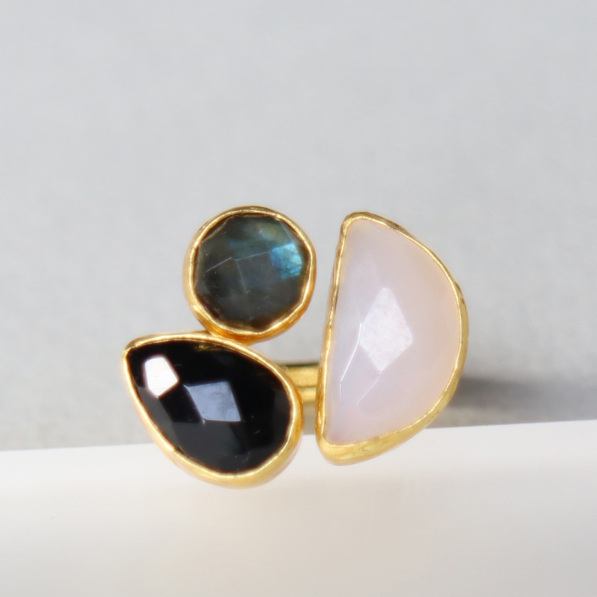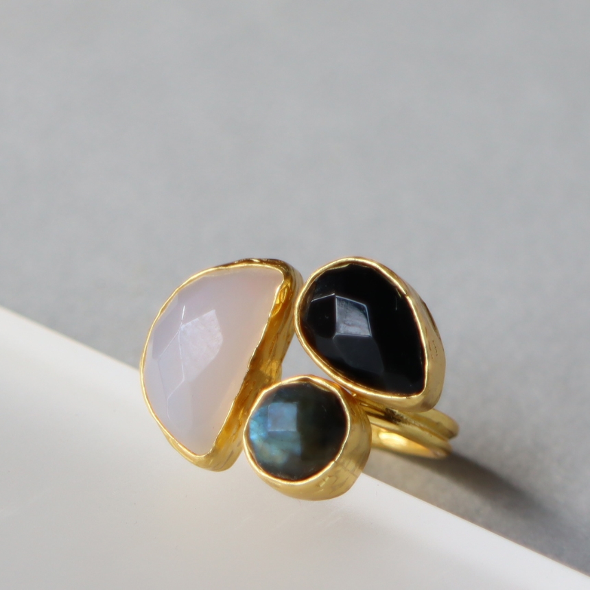 アルサメイア 三つの石のリング ホワイトカルセドニー×オニキス×ラブラトライト 天然石22KGP トルコジュエリー