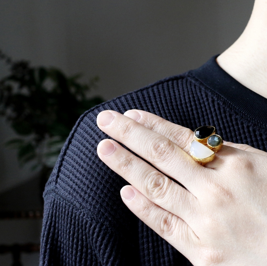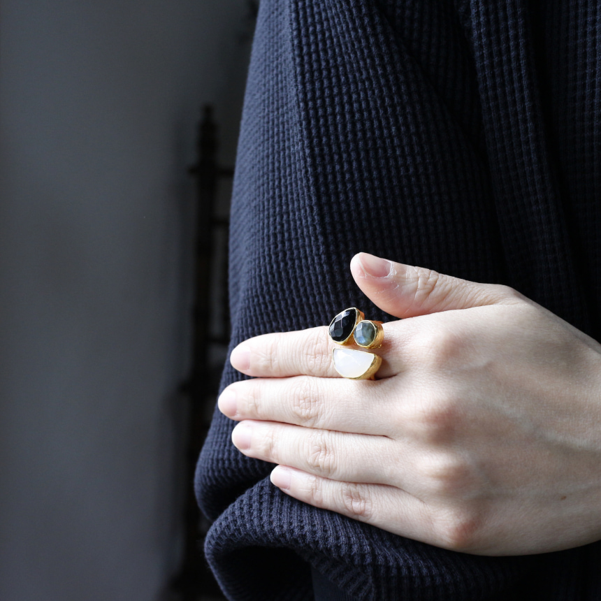 漆黒の輝きを湛えるオニキス、そして角度によって幻想的な青みある光を放つラブラドライト、柔らかな乳白色のホワイトカルセドニー。個性あふれる三つの石のモノトーンのコントラストがクールな印象のリングです。