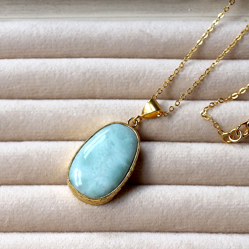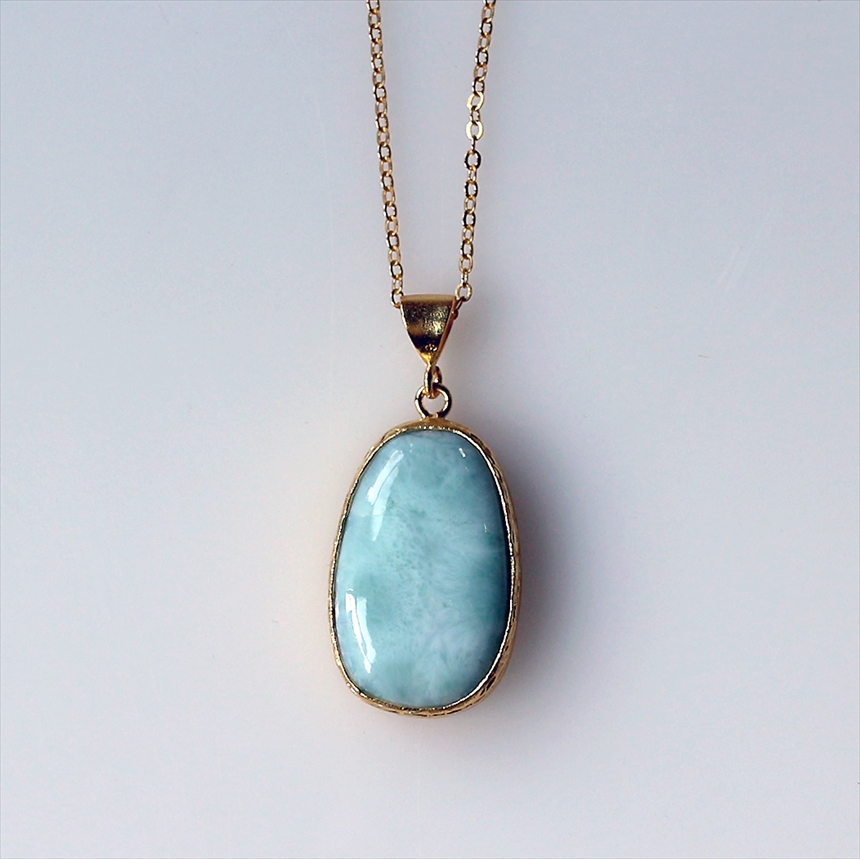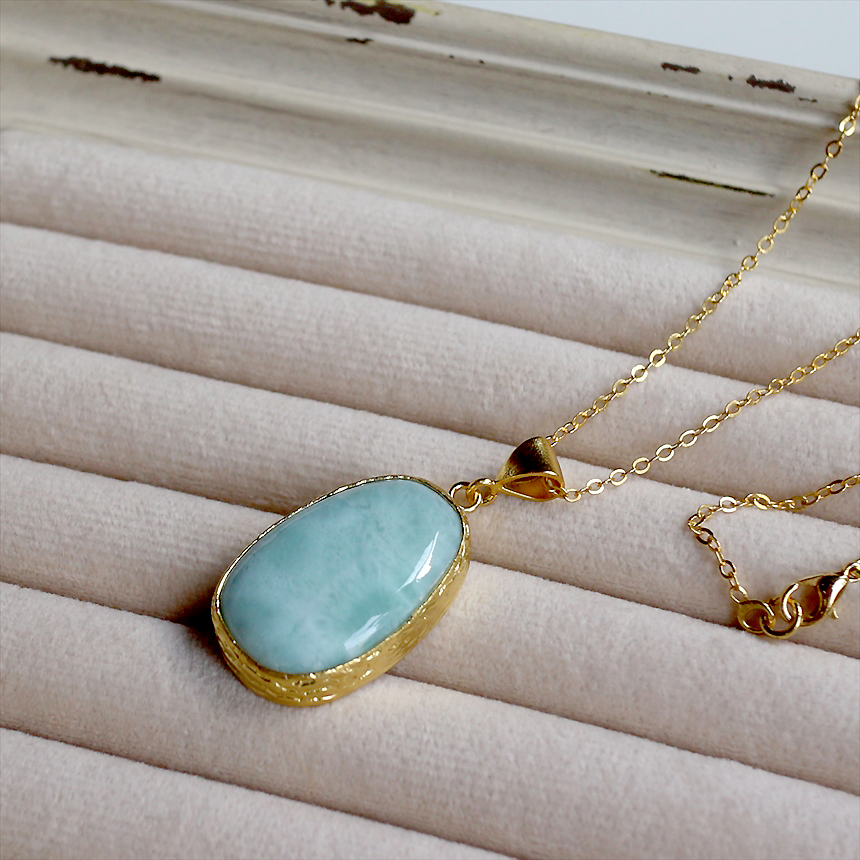 艶やかなブルーと白が何層にも重なり、美しい模様を描く、ラリマーのネックレス。つるんとした質感と、厚みのある立体的なフォルムが魅力です。ゴールドの縁取りが、ラリマーの鮮やかさを上品に引き立てます。