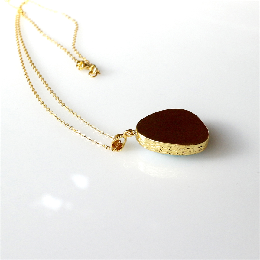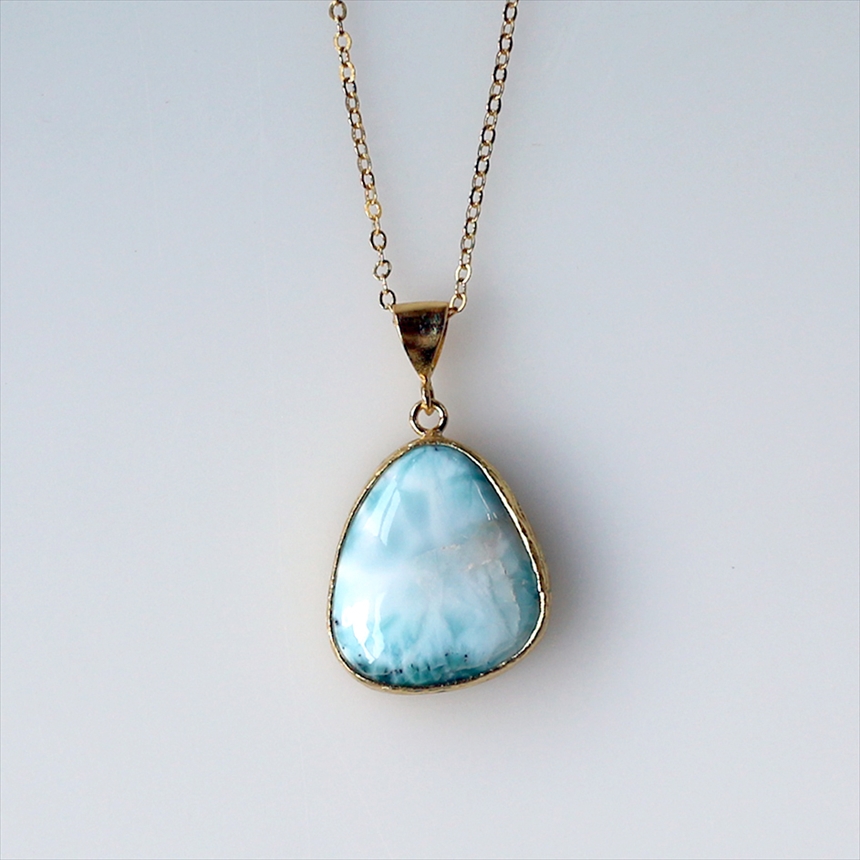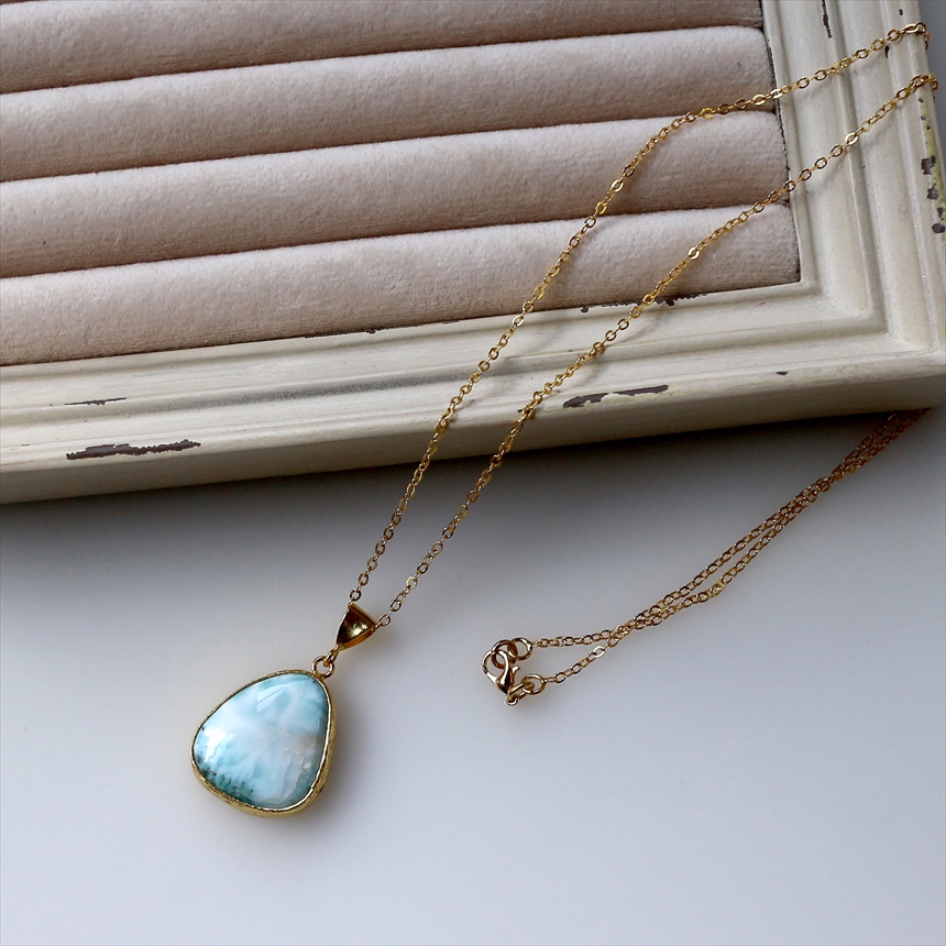 艶やかなブルーと白が何層にも重なり、美しい模様を描く、ラリマーのネックレス。つるんとした質感と、厚みのある立体的なフォルムが魅力です。ゴールドの縁取りが、ラリマーの鮮やかさを上品に引き立てます。