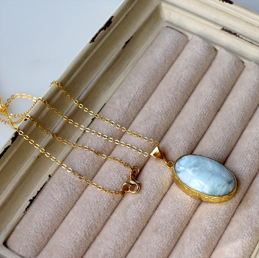 艶やかなブルーと白が何層にも重なり、美しい模様を描く、ラリマーのネックレス。つるんとした質感と、厚みのある立体的なフォルムが魅力です。ゴールドの縁取りが、ラリマーの鮮やかさを上品に引き立てます。
