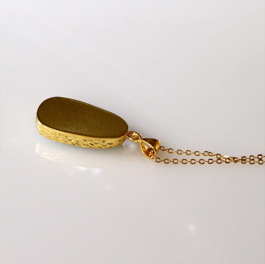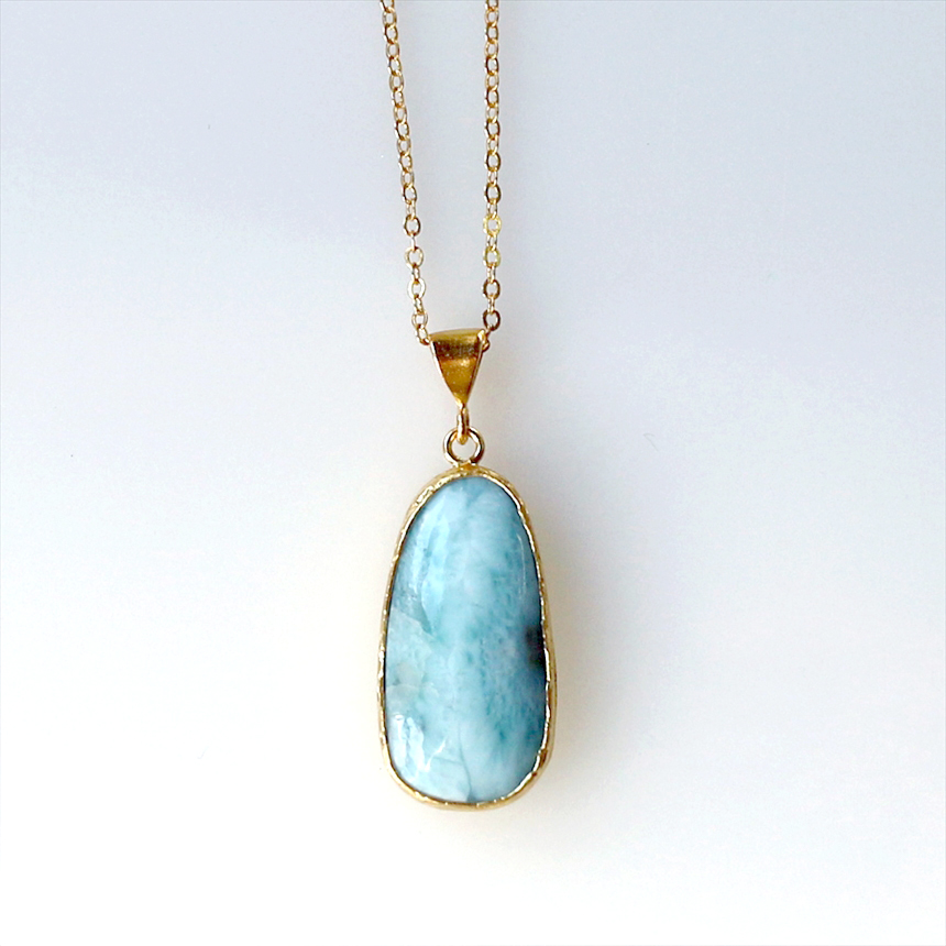 艶やかなブルーと白が何層にも重なり、美しい模様を描く、ラリマーのネックレス。つるんとした質感と、厚みのある立体的なフォルムが魅力です。ゴールドの縁取りが、ラリマーの鮮やかさを上品に引き立てます。