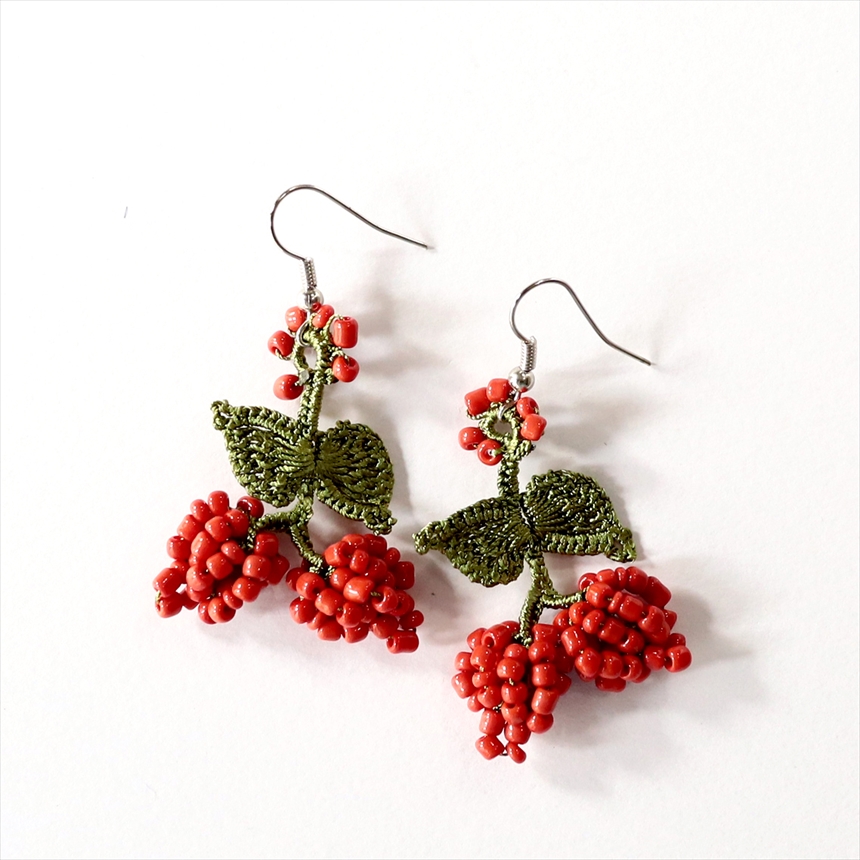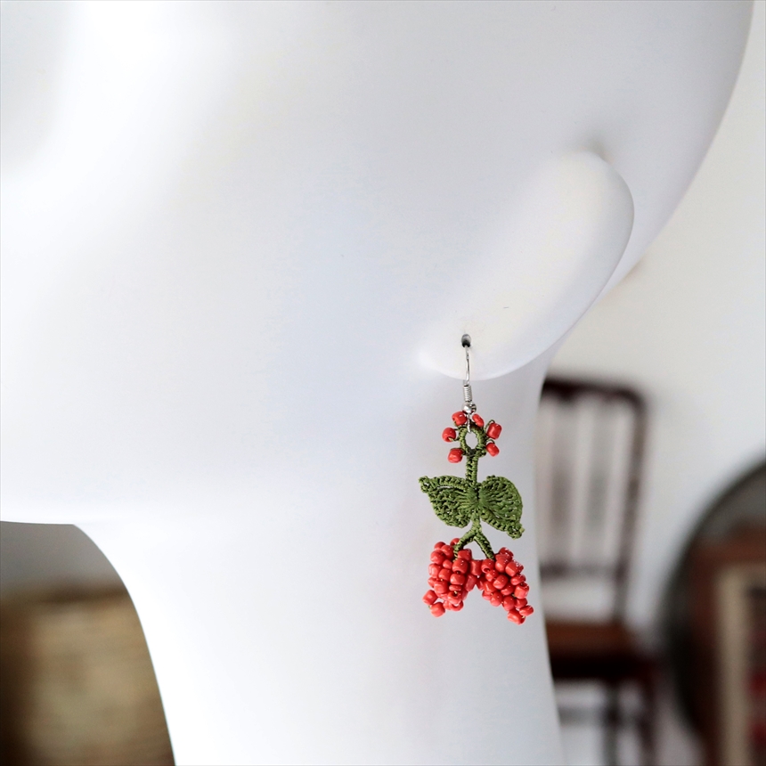 トルコのレース「オヤ」 ピアス さくらんぼ 朱赤 ボンジュックオヤ ハンドメイド