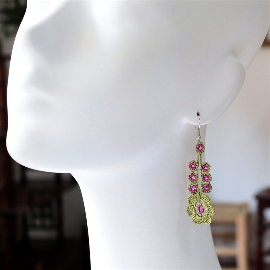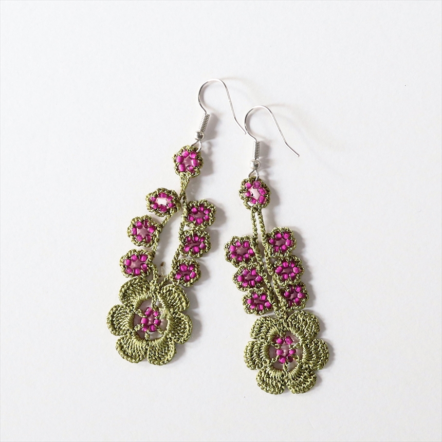 トルコの伝統的な手芸「オヤ」をモチーフにしたピアスです。金具との接続がねじれてしまっているところなどありますので、少し湿らせて整形してお使いください。※在庫が複数ございますので、写真と色は同じですがカタチなど少し違っている場合もありますことをご了承願います。