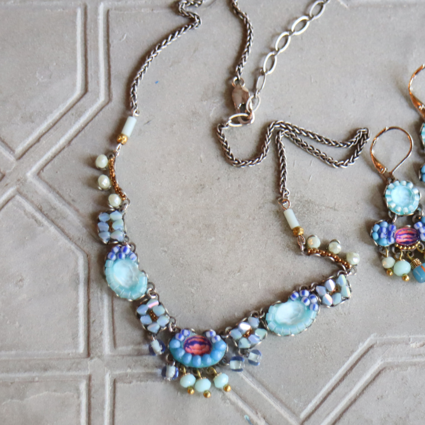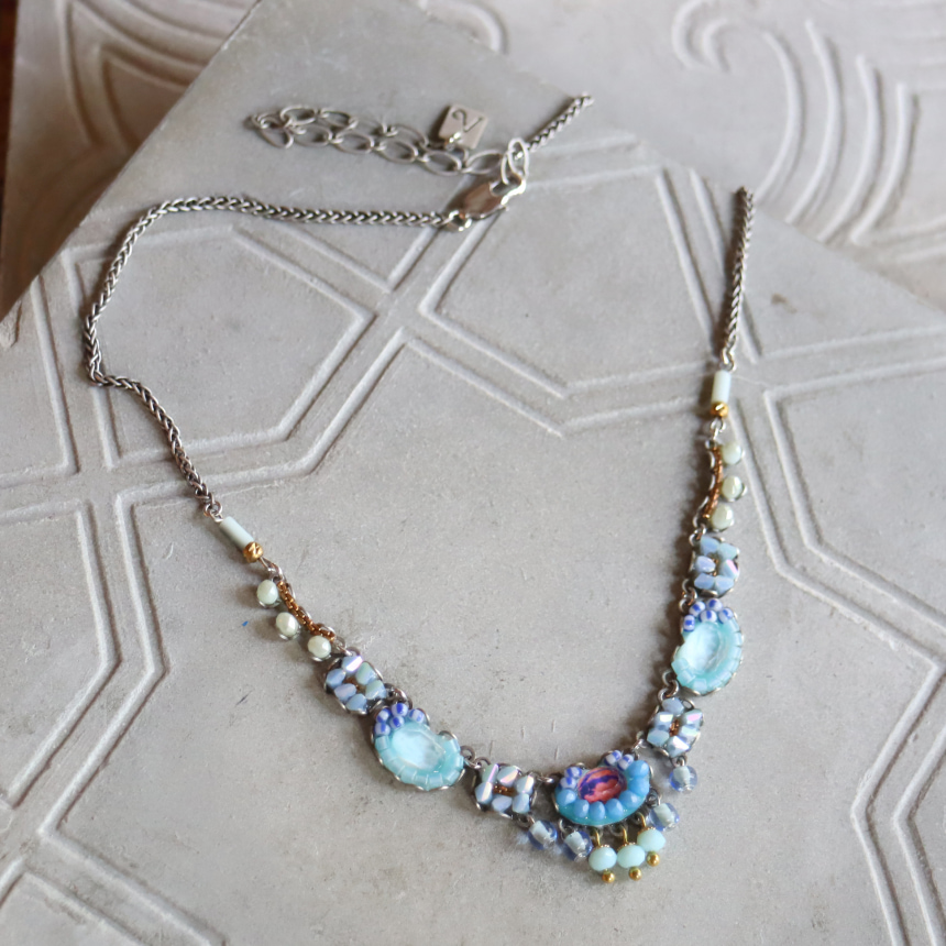 ブルーグラデーションの繊細なビーズ細工が優雅さを醸し出す、Blue Birdという名のシリーズ。少しマットな質感のビーズに中央のピンクがアクセントになっています。