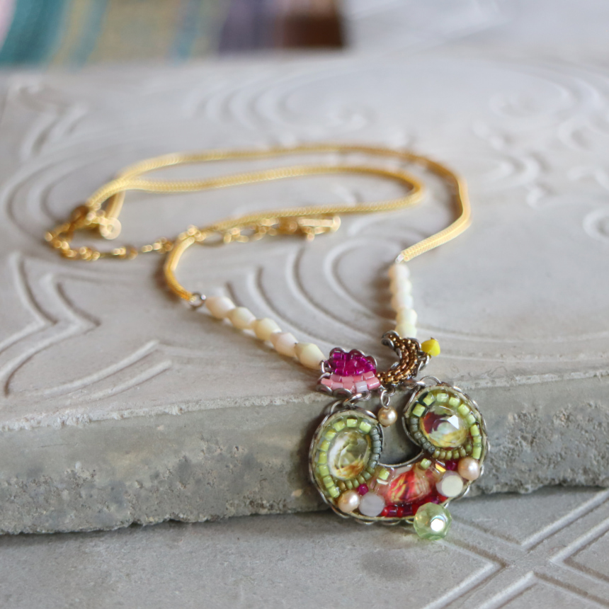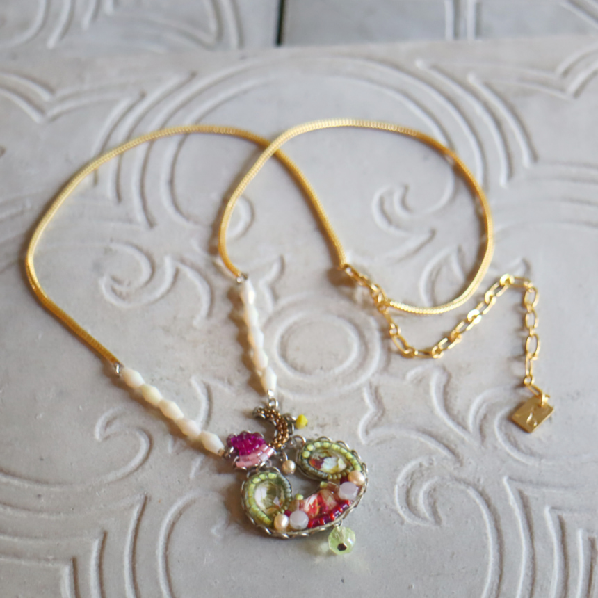 明るい色合いに遊び心あるパーツの組み合わせが魅力の、Lemonadeという名の通り、甘酸っぱい印象のシリーズ。淡い黄色系のビーズが揺れ、乳白色のパールとの組み合わせは、爽やかで清涼感があり、上品さと可愛らしさを感じるデザインのネックレスです。