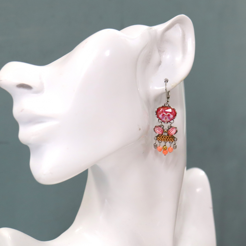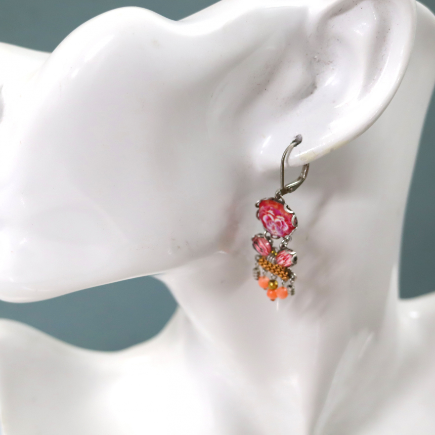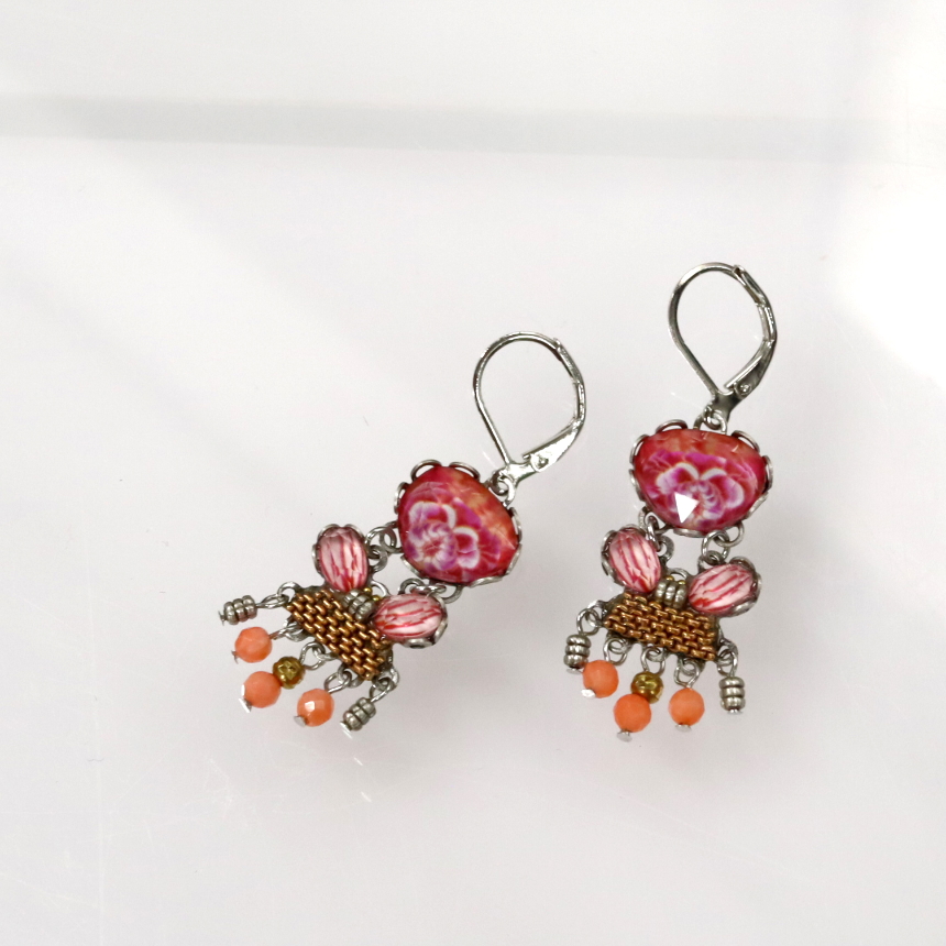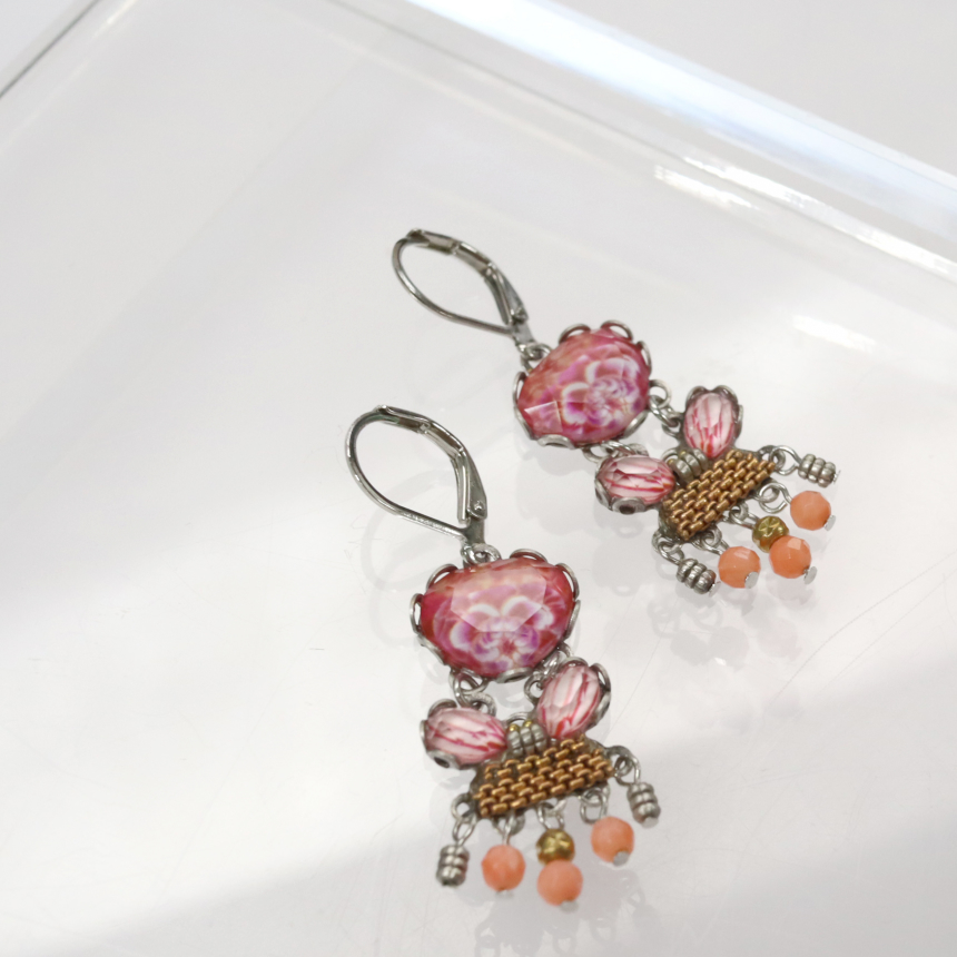 繊細でローズトーンが優雅な印象の、Rose Embraceという名のシリーズ。クリスタルには細やかな植物などのプリントファブリックが写ります。先についたサーモンピンクのビーズが揺れるロマンティックな雰囲気のピアスです。