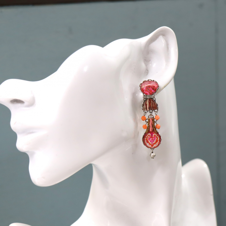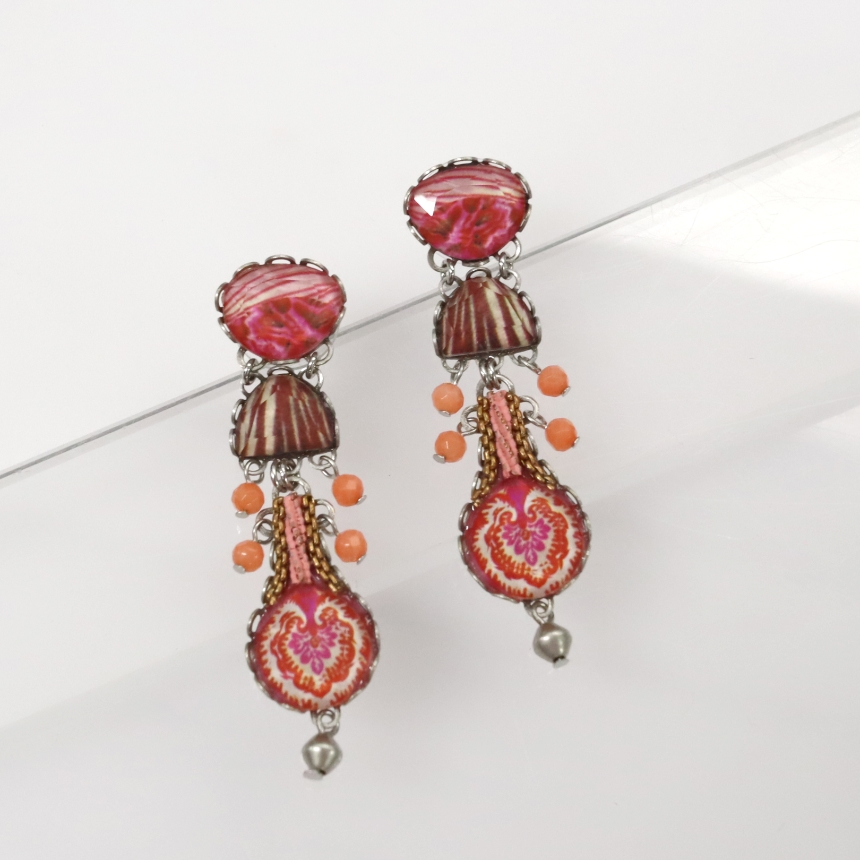 繊細でローズトーンが優雅な印象の、Rose Embraceという名のシリーズ。クリスタルには細やかな植物などのプリントファブリックが写ります。先についたサーモンピンクのビーズが揺れるロマンティックな雰囲気のピアスです。