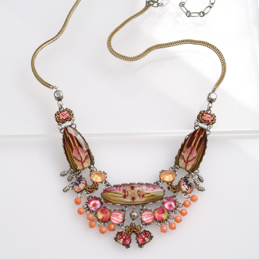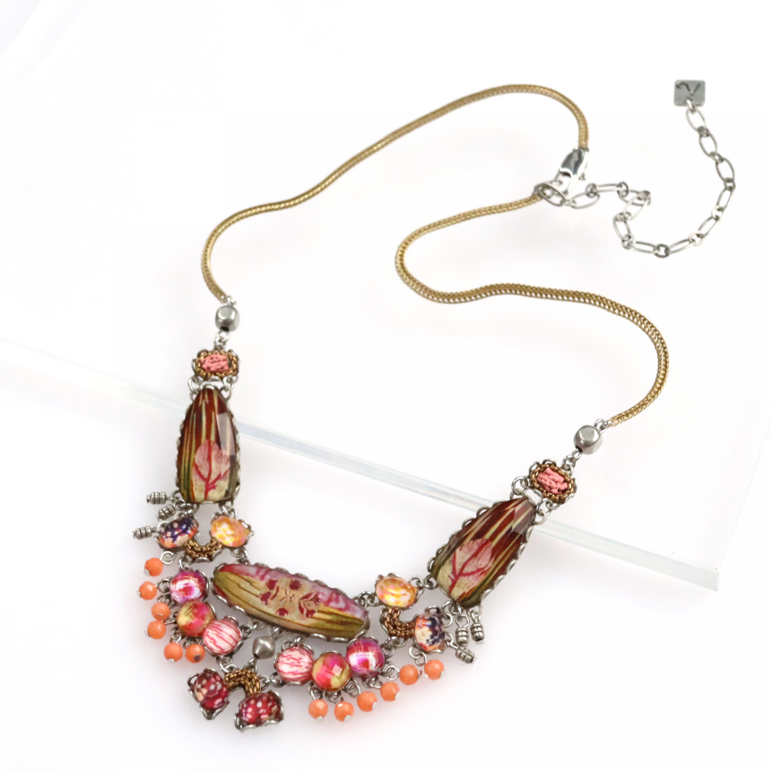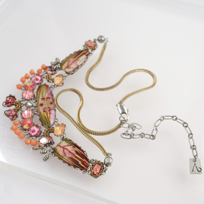 繊細でローズトーンが優雅な印象の、Rose Embraceという名のシリーズ。クリスタルには細やかな植物などのプリントファブリックが写ります。先についたサーモンピンクのビーズが揺れるロマンティックな雰囲気のネックレスです。ゴールドのチェーンは、少しずつ落ち着いた色に変化します。