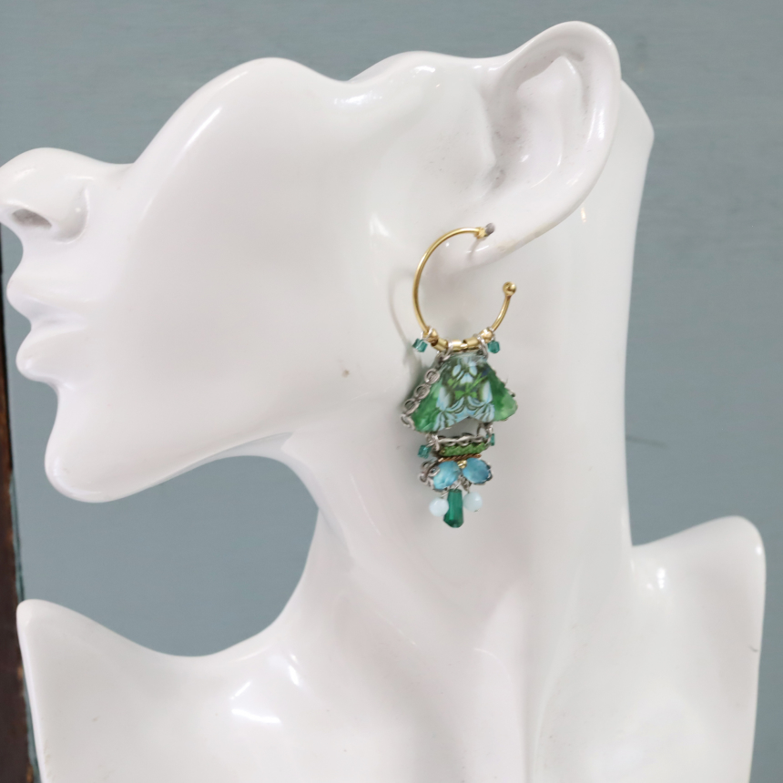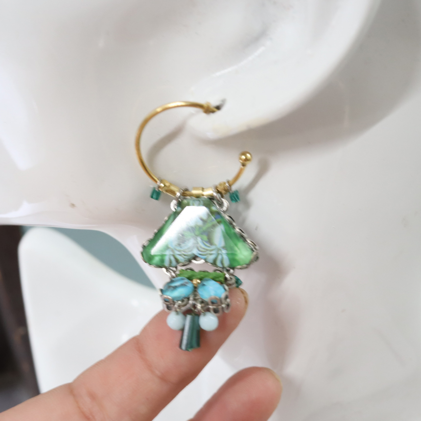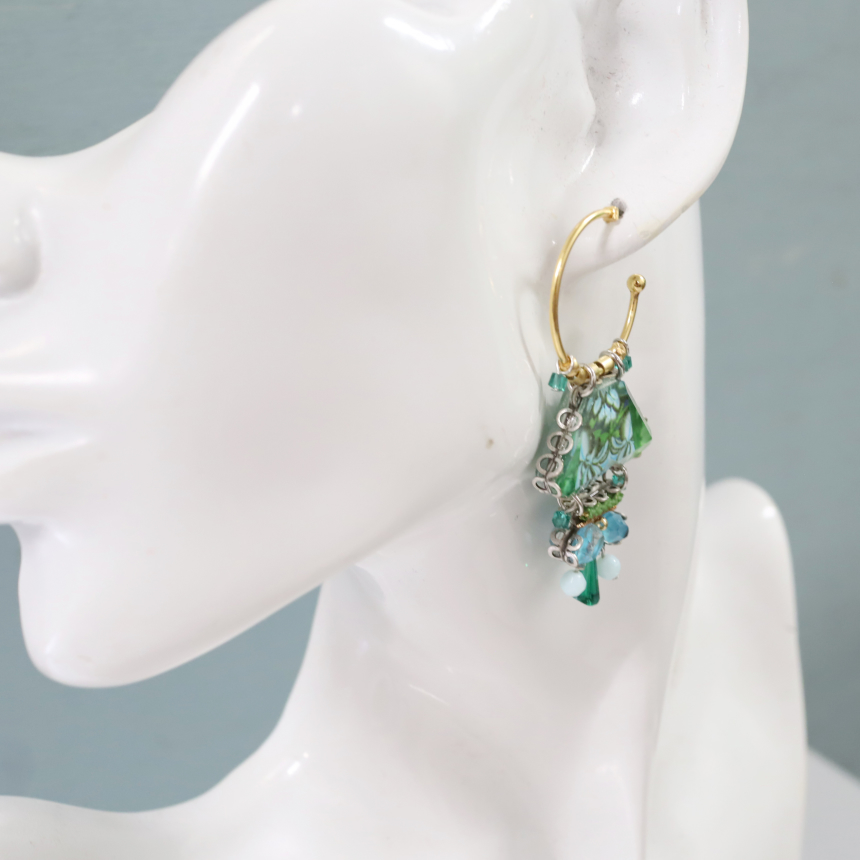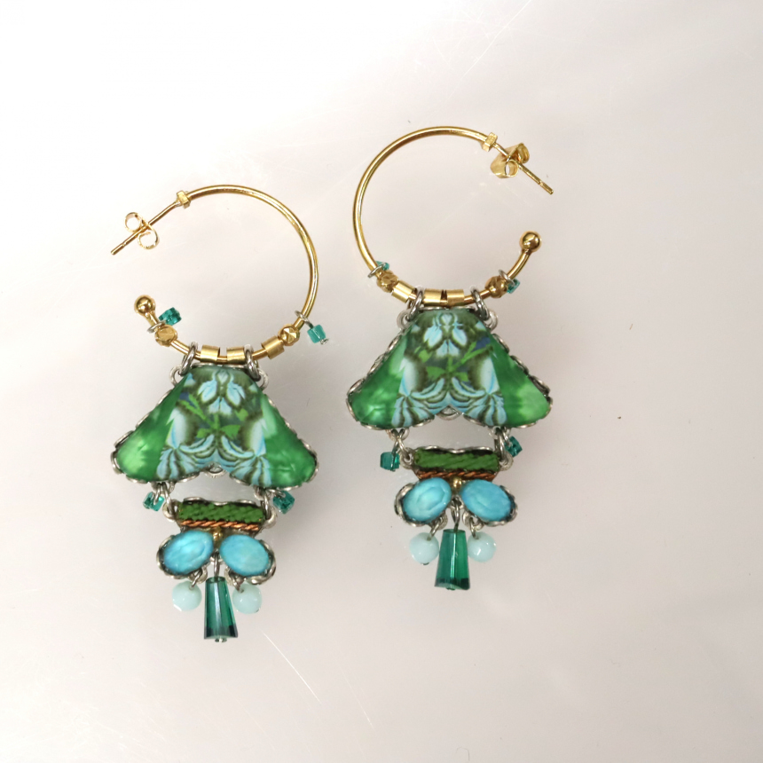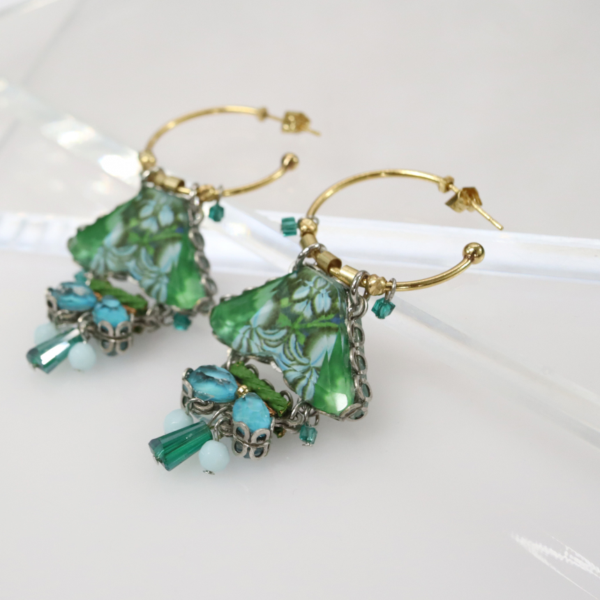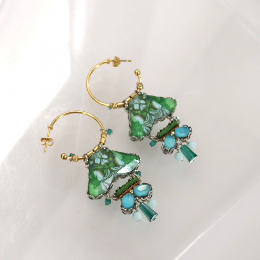 深みあるグリーンやブルー、やわらかなブラウンのアースカラーが静かな草原をイメージさせる美しい、Meadowという名のシリーズ。描かれた草木の模様がクリスタルに写ります。モチーフの両面がクォーツになっていて、立体的なデザイン。やや重みを感じる、存在感あるフープピアスです。
