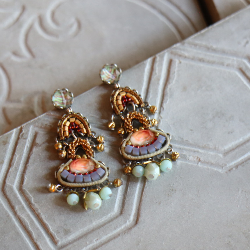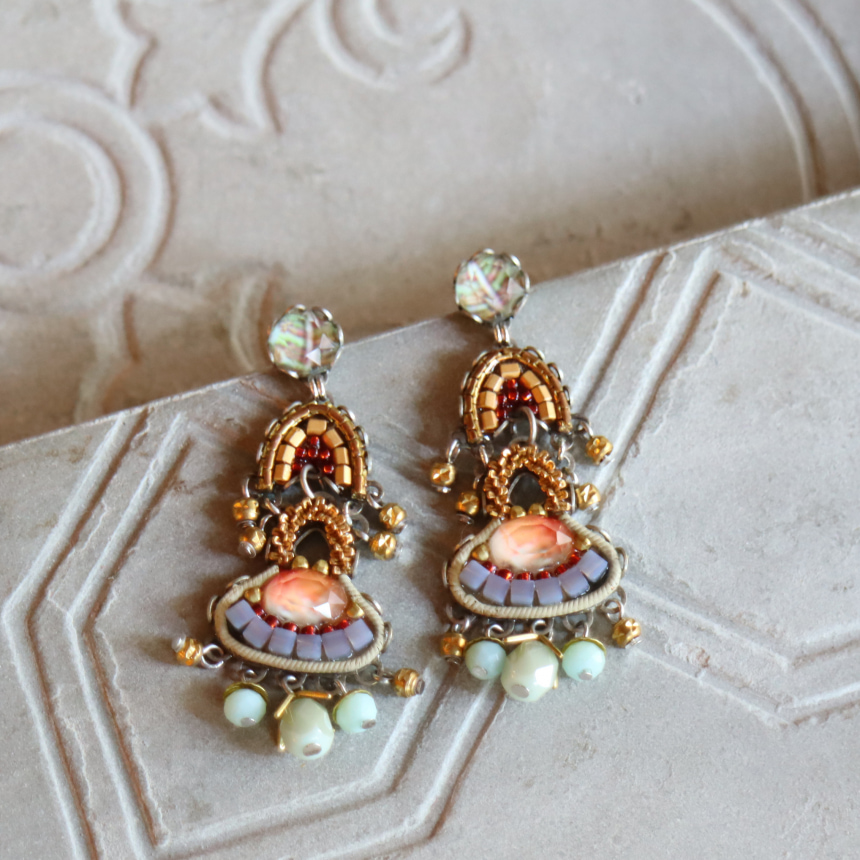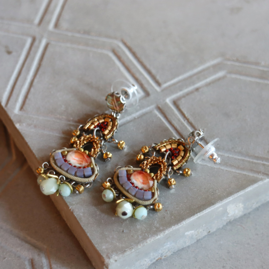 エレガントなメタリックの洗練された輝きが魅力の、Metallic Medleyという名のシリーズ。艶をおさえたゴールドカラーにブルーグレーのビーズが落ち着いた印象のピアスです。