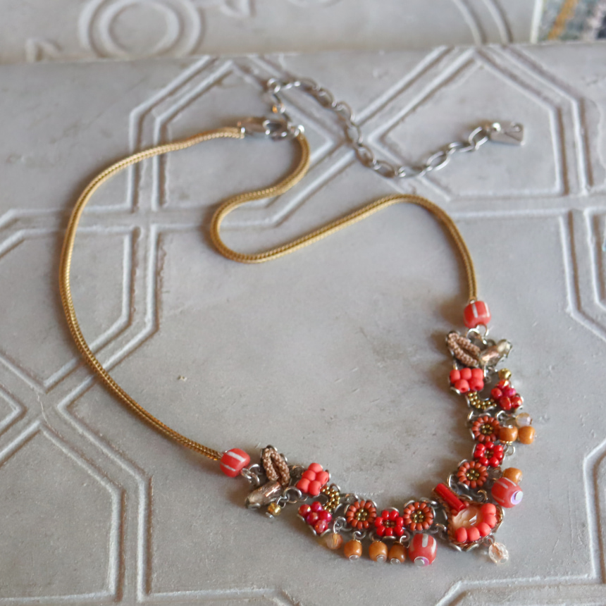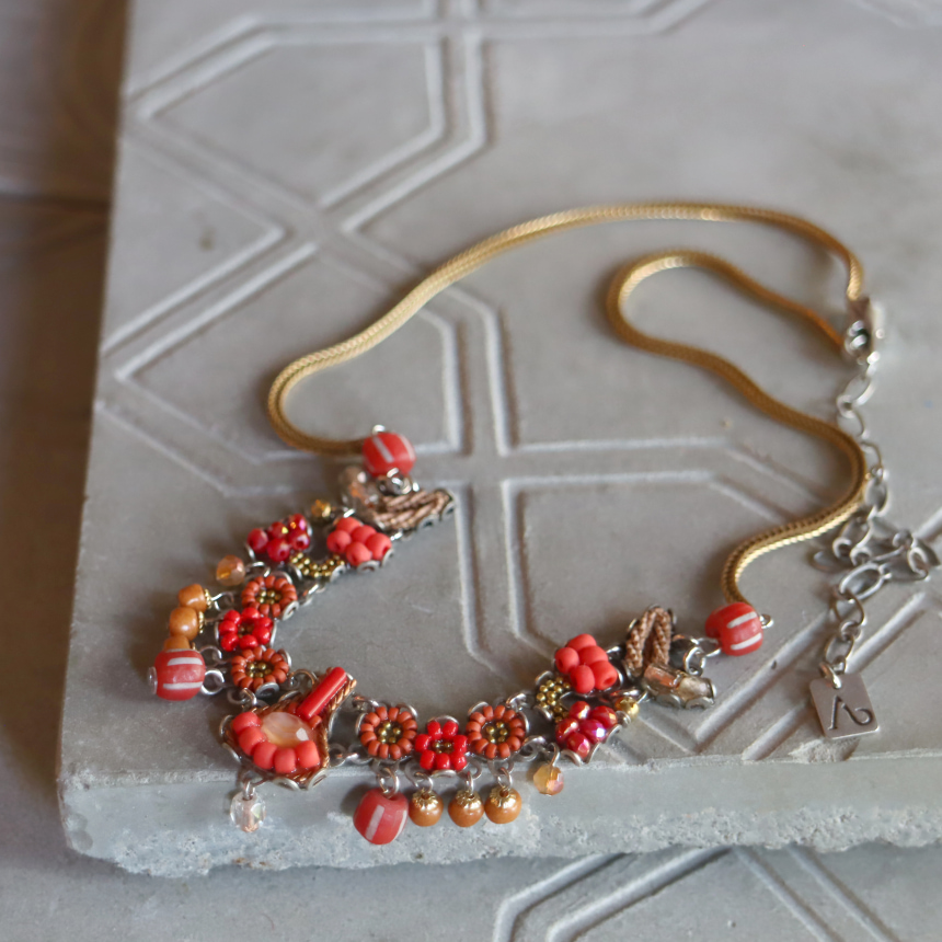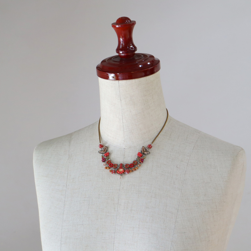 深みあるマットな質感のレッドグラデーションに、ゴールドパーツが揺れる、Radical Redという名のシリーズ。小振りながらも細かなビーズのシャラシャラとした動きが目を引くデザイン。ゴールドのチェーンは、少しずつ落ち着いた色合いに変化します。