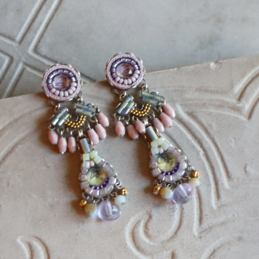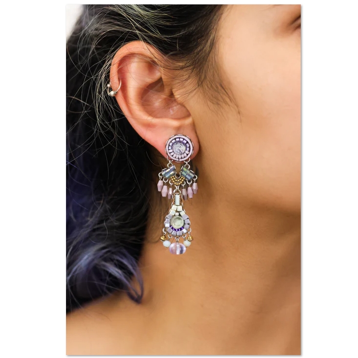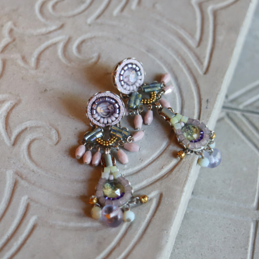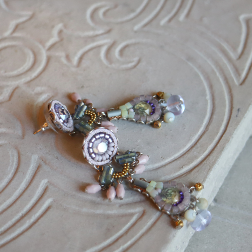 淡いパープル、グレー、ブルーやベージュピンクの柔らかな色合いが魅力的な、ヒヤシンスという名のシリーズ。落ち着いたトーンの中にもさりげない華やかさのあるピアスです。