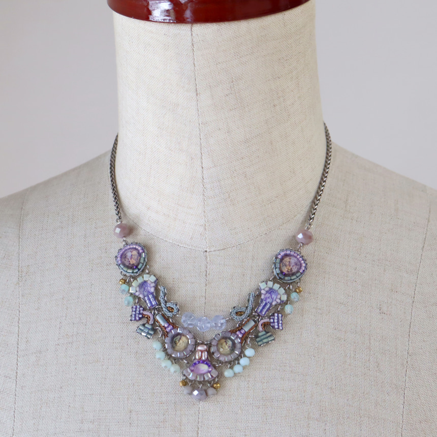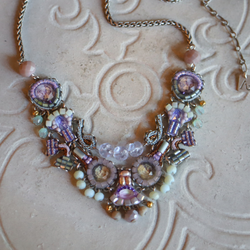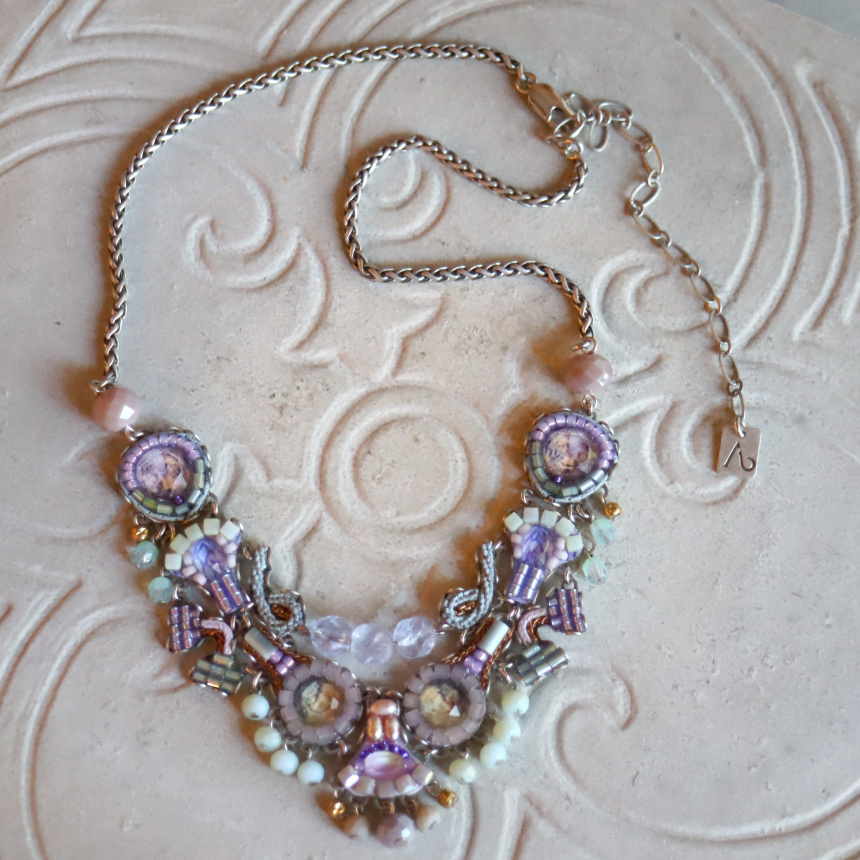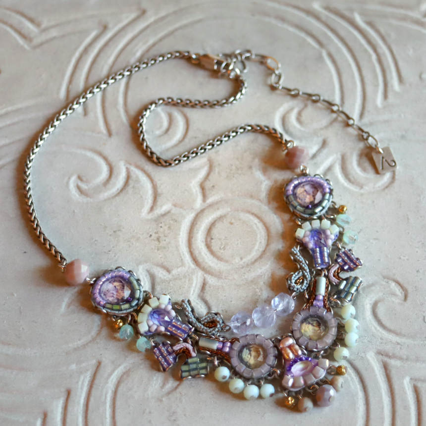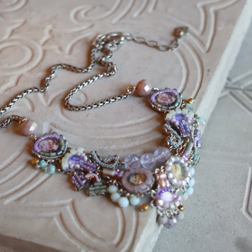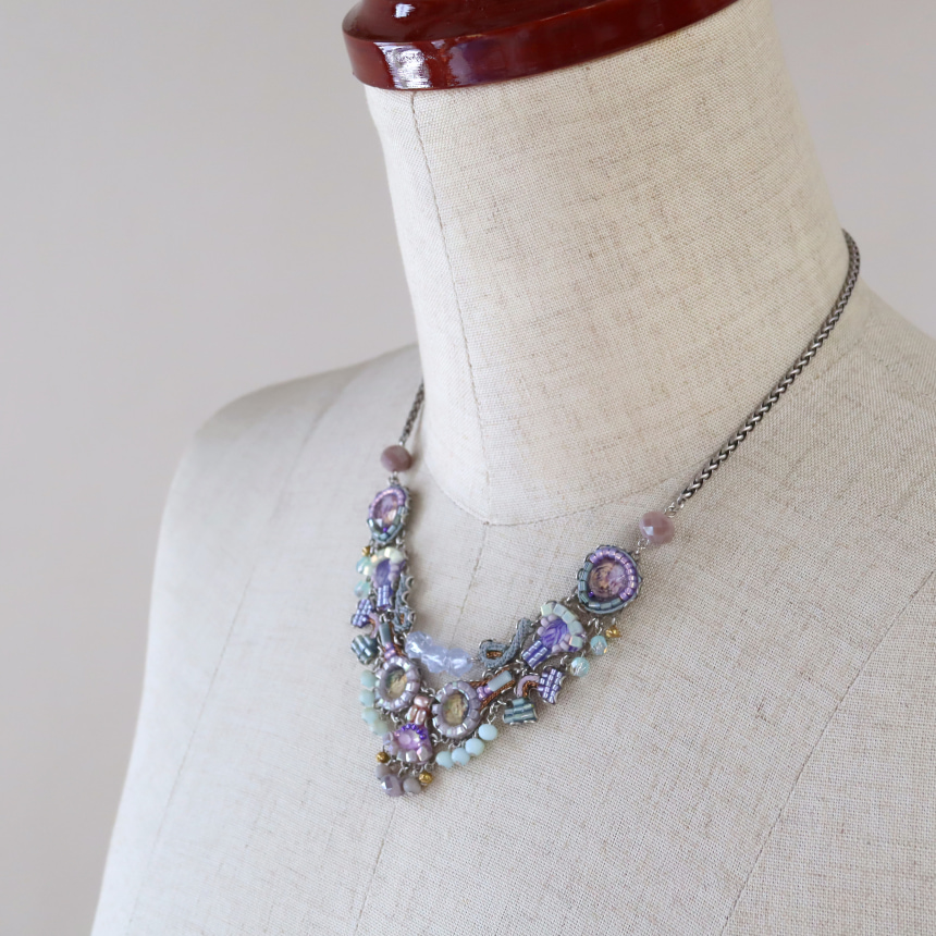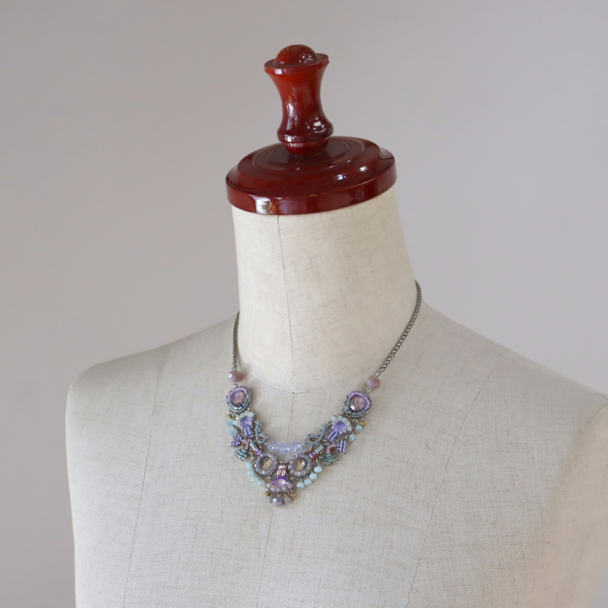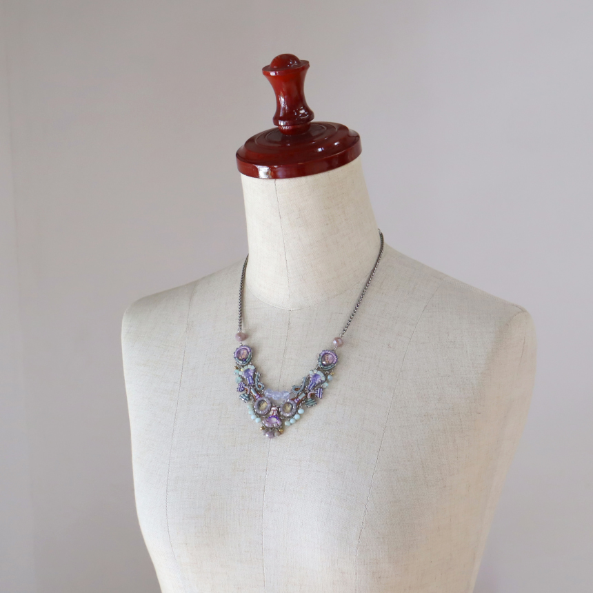 淡いパープル、グレー、ブルーやベージュピンクの柔らかな色合いが魅力的な、ヒヤシンスという名のシリーズ。落ち着いたトーンの中にもさりげない華やかさのあるネックレスです。