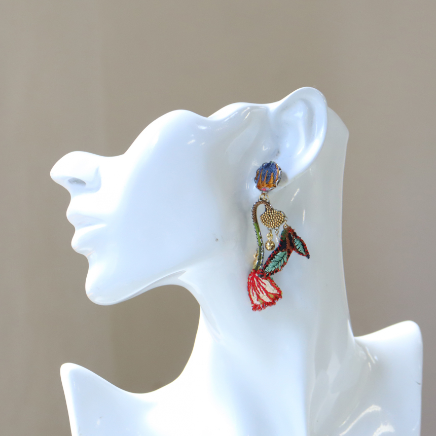 刺繍された花々がまるでそのままアクセサリーになったような、繊細で詩的なEmbroidered Gardenという名のシリーズ。庭園を切り取ったかのような、幻想的な世界観が魅力です。手仕事ならではの優しい質感が、軽やかで着け心地もよいピアスです。