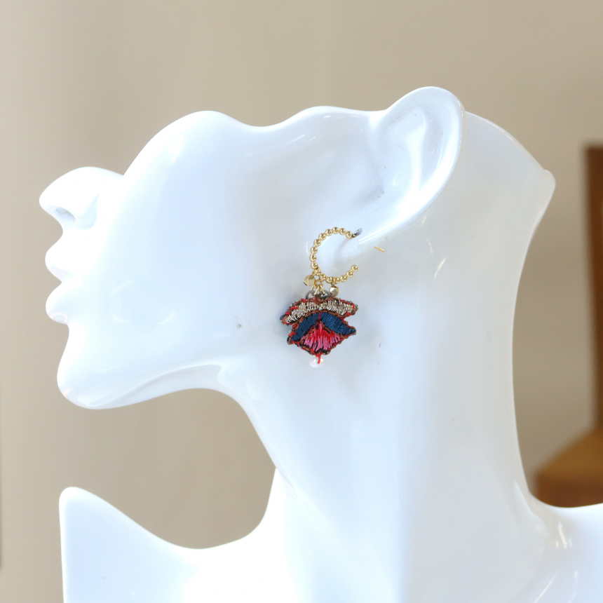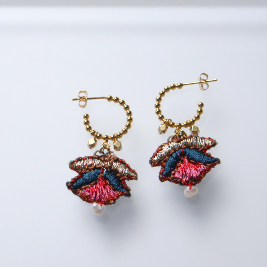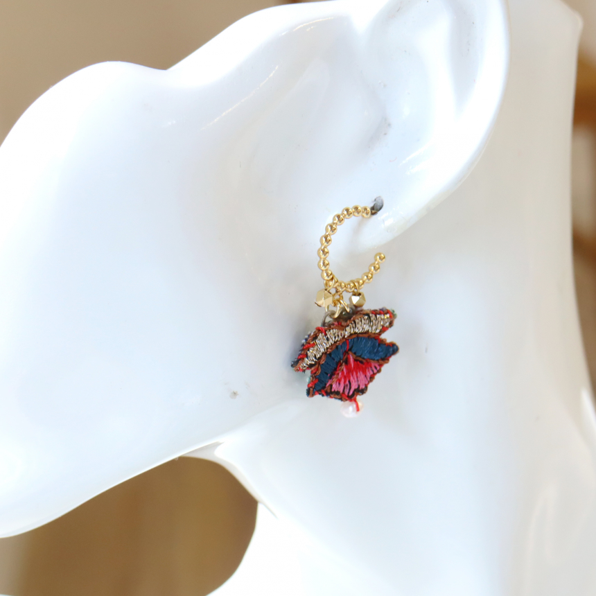 刺繍された花々がまるでそのままアクセサリーになったような、繊細で詩的なEmbroidered Gardenという名のシリーズ。庭園を切り取ったかのような、幻想的な世界観が魅力です。手仕事ならではの優しい質感が、軽やかで着け心地もよいピアスです。