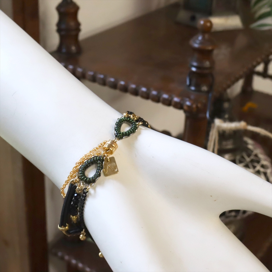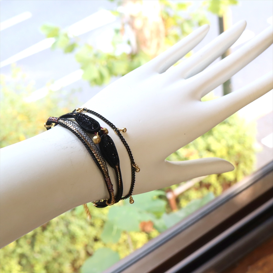 きらめくブラックビーズと艶をおさえたゴールドの融合が印象的な、Gilded Blackという名のシリーズ。繊細でユニークなパーツで表現されたさりげなく華やかなデザインのブレスレットです。