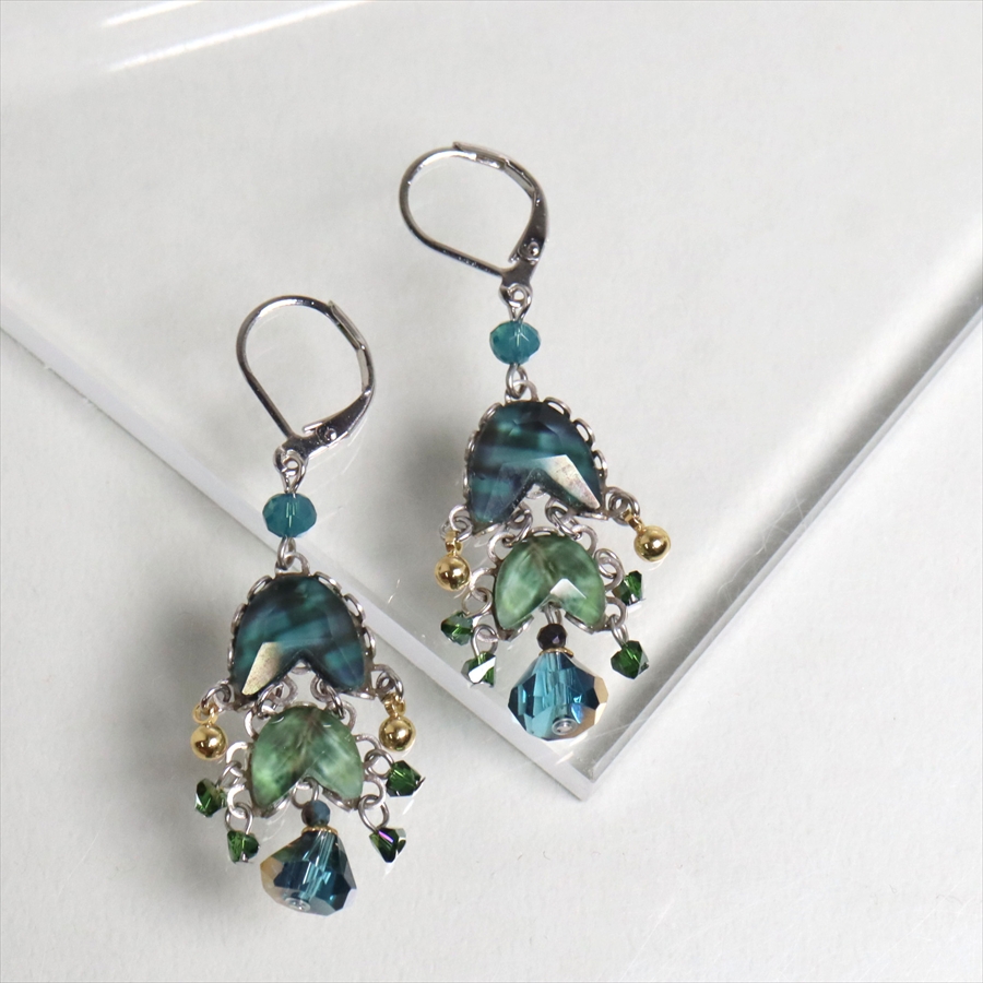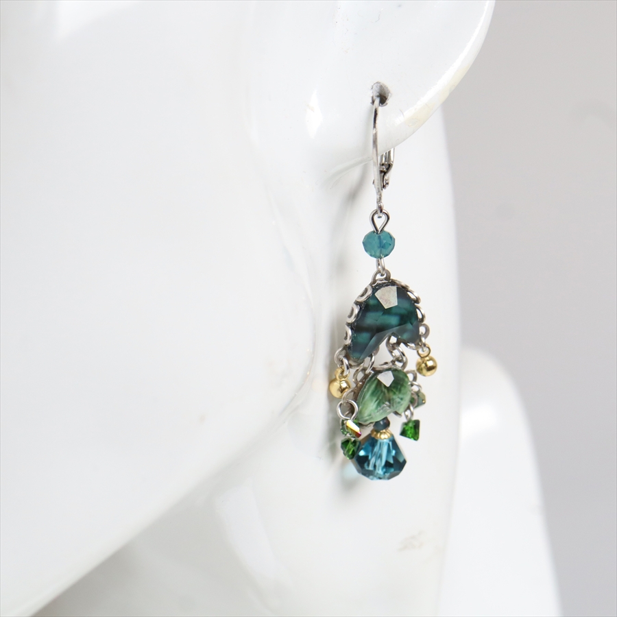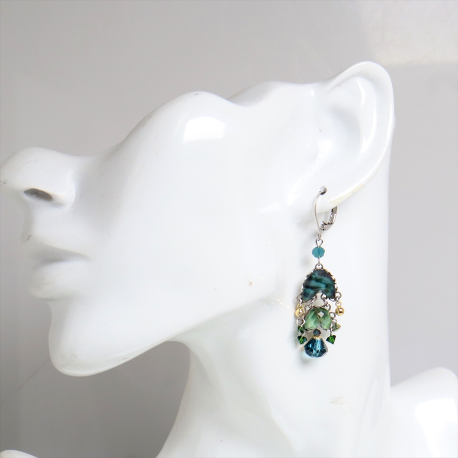 青みある深いグリーンが光を受けて、ガラスビーズに反射し優し気に輝く、Emerald Reflectionという名のシリーズ。水面に映る森のような幻想的な美しさを演出しているような雰囲気の揺れるピアスです。