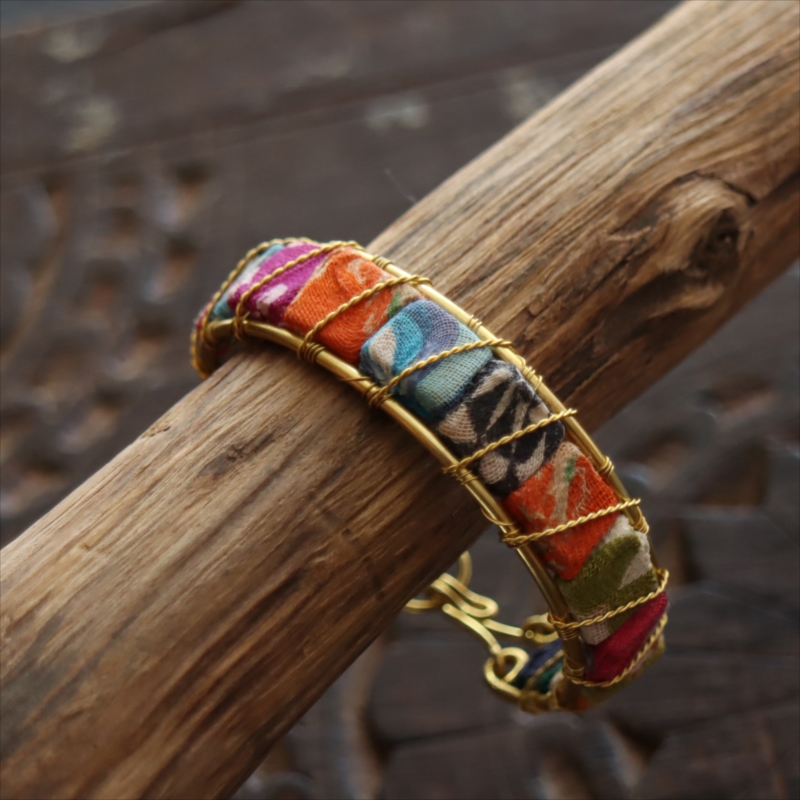 フックでとめるタイプのバングルです。布で包まれた14粒の四角いビーズを並べ、真鍮ワイヤーでつないであります。