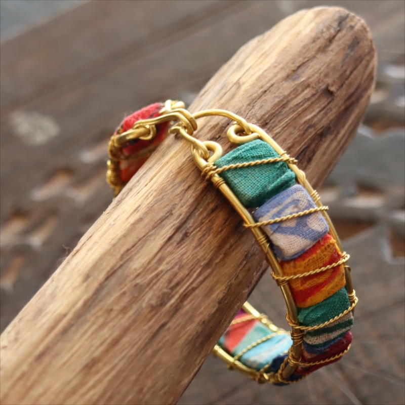 フックでとめるタイプのバングルです。布で包まれた14粒の四角いビーズを並べ、真鍮ワイヤーでつないであります。