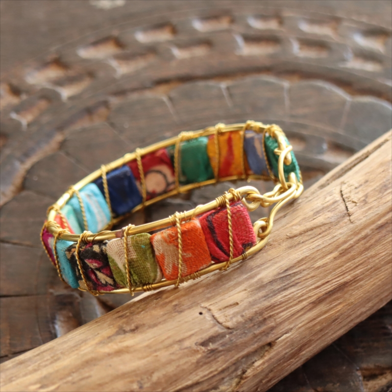 リサイクルサリー バングル 布 クラフトビーズ カラフルな四角いタイル