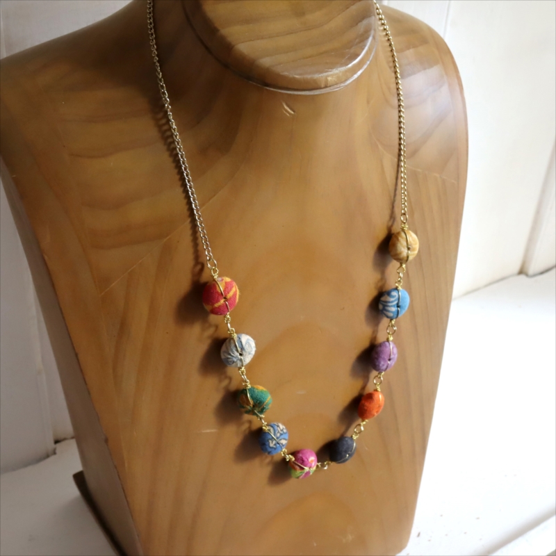リサイクルサリーの布で包まれたカラフルな10粒のビーズを、真鍮チェーンでつなぎ合わせた手作り感あるネックレスです。60cmの長さがあり、軽い作りなので、セーターやTシャツなどに合わせてカジュアルに楽しめます。