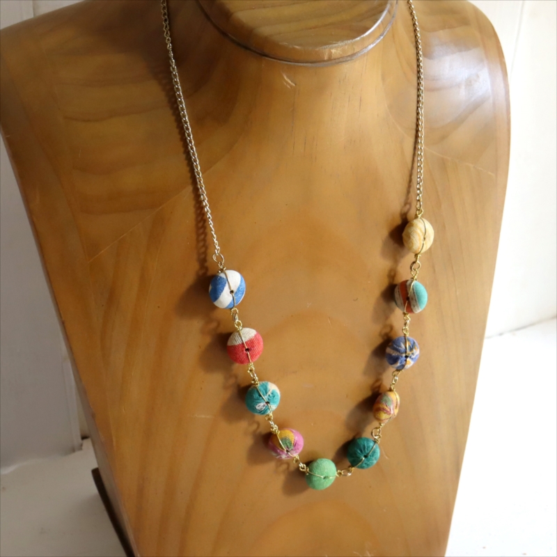 リサイクルサリーの布で包まれたカラフルな10粒のビーズを、真鍮チェーンでつなぎ合わせた手作り感あるネックレスです。60cmの長さがあり、軽い作りなので、セーターやTシャツなどに合わせてカジュアルに楽しめます。