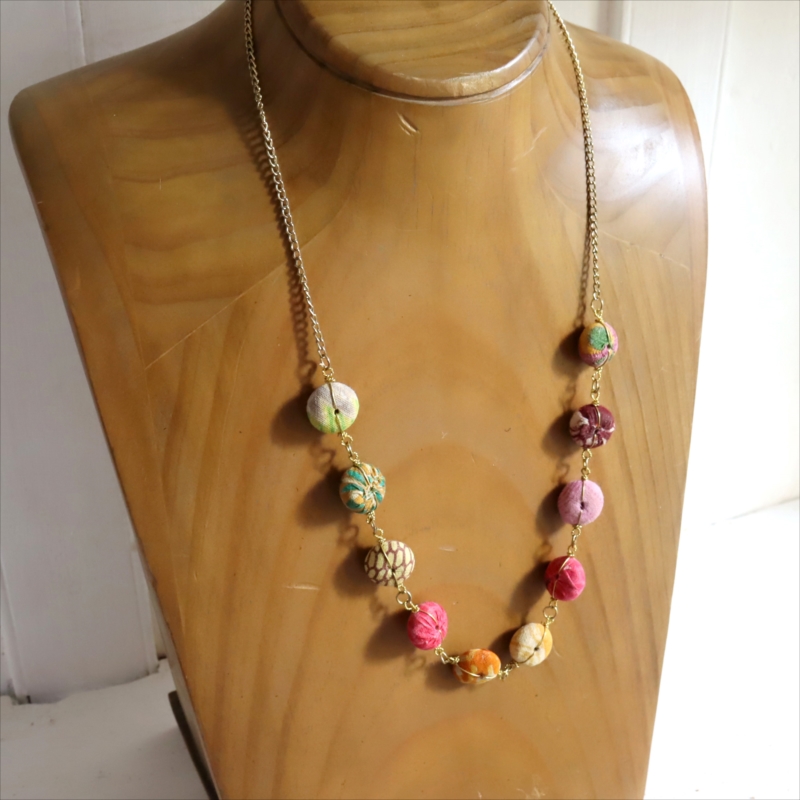 リサイクルサリーの布で包まれたカラフルな10粒のビーズを、真鍮チェーンでつなぎ合わせた手作り感あるネックレスです。60cmの長さがあり、軽い作りなので、セーターやTシャツなどに合わせてカジュアルに楽しめます。