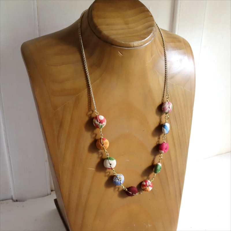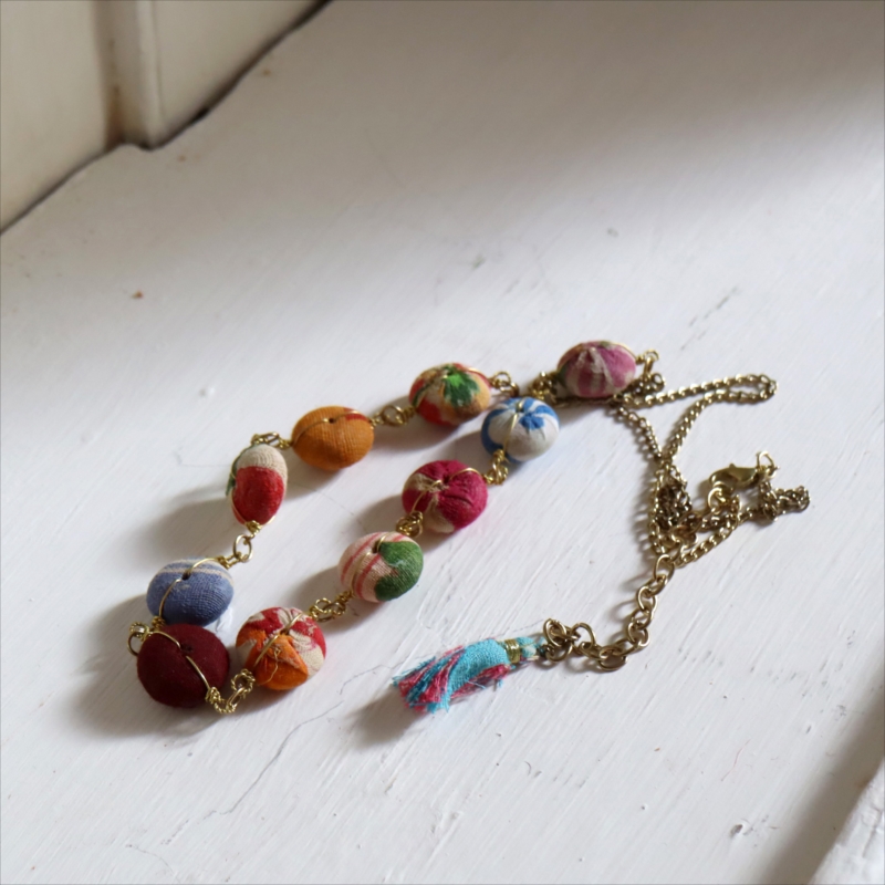 リサイクルサリーの布で包まれたカラフルな10粒のビーズを、真鍮チェーンでつなぎ合わせた手作り感あるネックレスです。60cmの長さがあり、軽い作りなので、セーターやTシャツなどに合わせてカジュアルに楽しめます。
