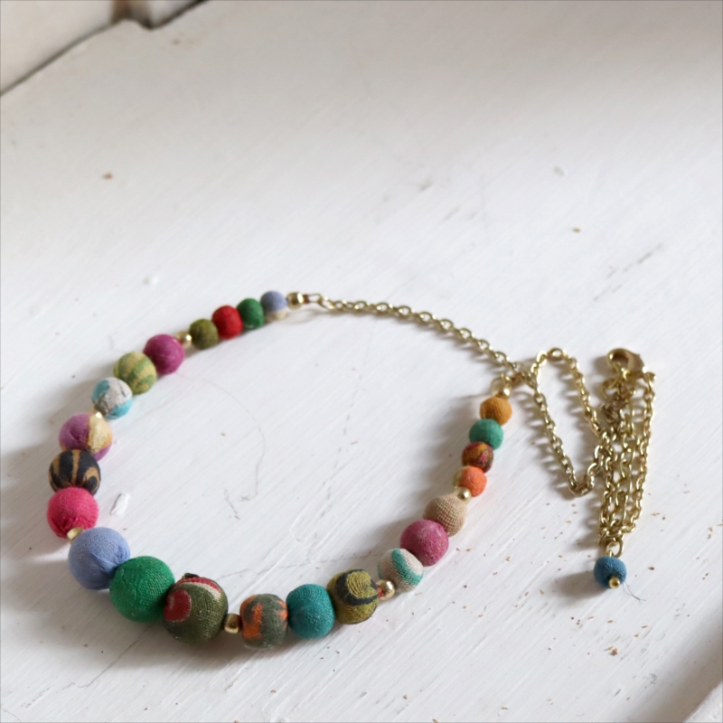 大きさの異なる布で包まれたビーズをつないだクラフト感あるネックレスです。