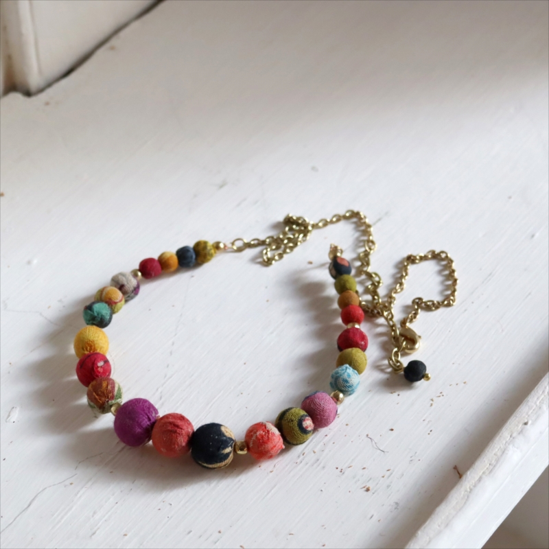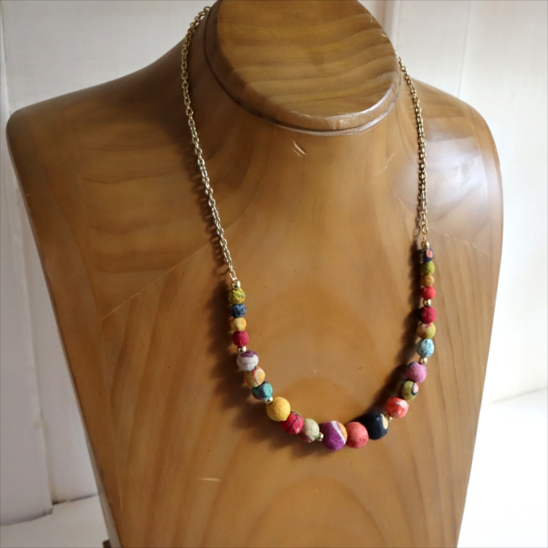 大きさの異なる布で包まれたビーズをつないだクラフト感あるネックレスです。