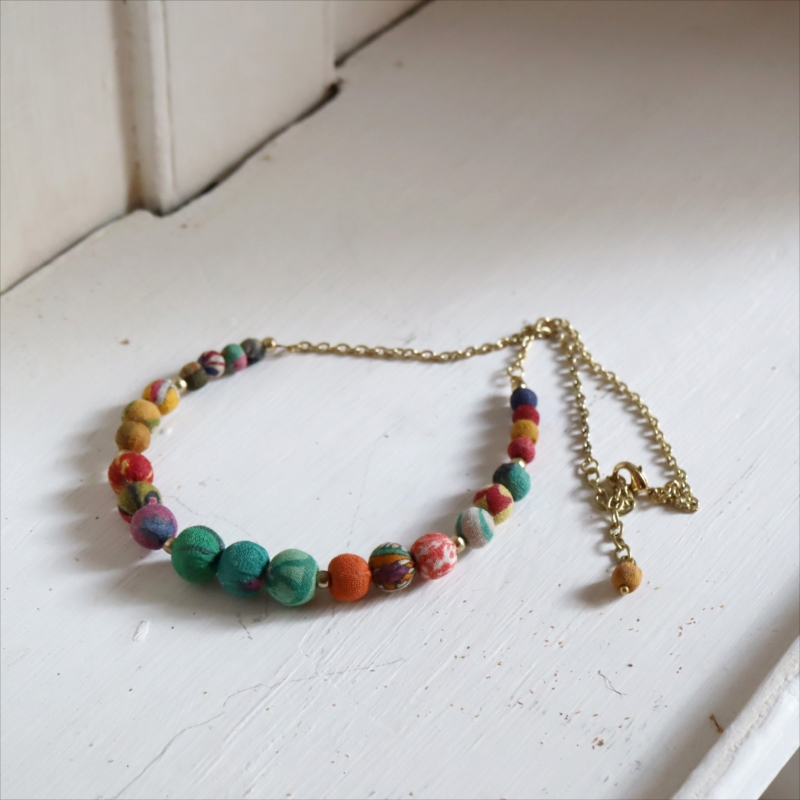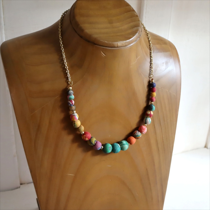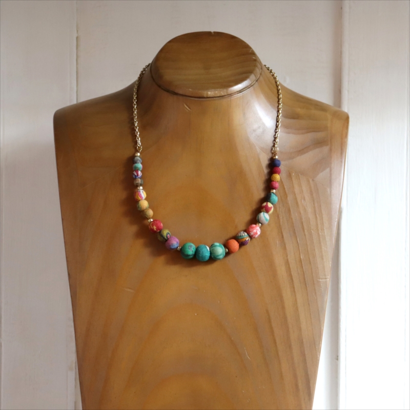 大きさの異なる布で包まれたビーズをつないだクラフト感あるネックレスです。