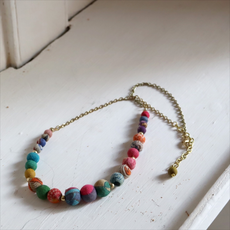 大きさの異なる布で包まれたビーズをつないだクラフト感あるネックレスです。