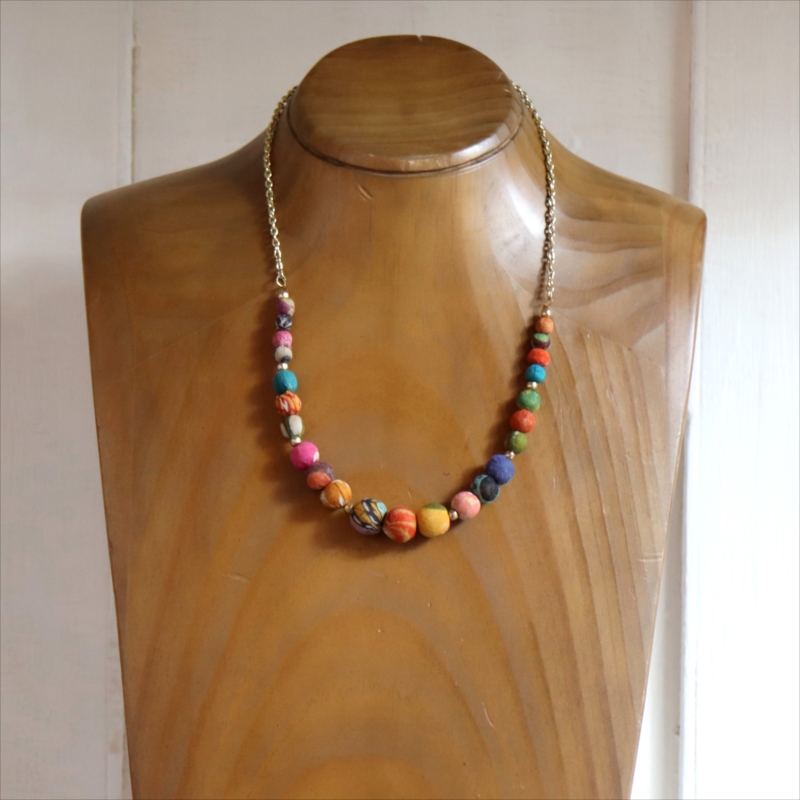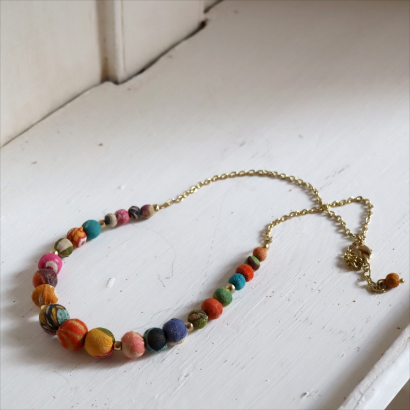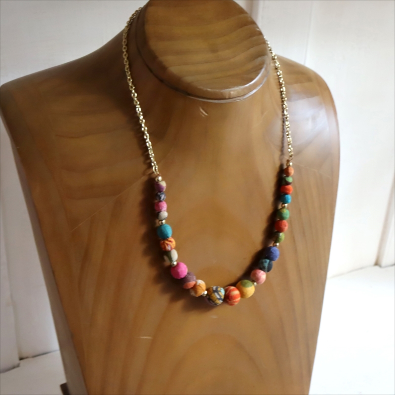 大きさの異なる布で包まれたビーズをつないだクラフト感あるネックレスです。