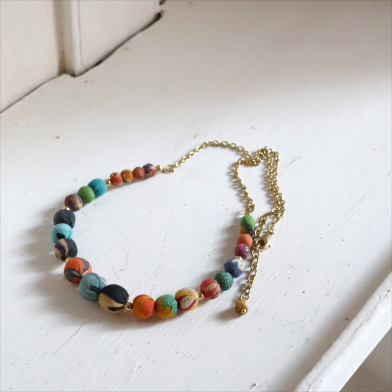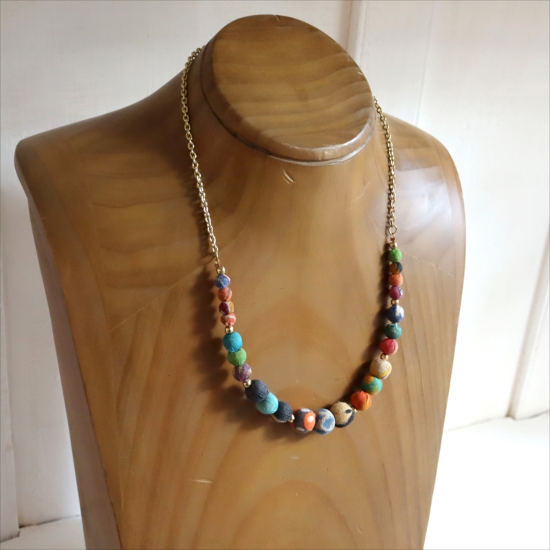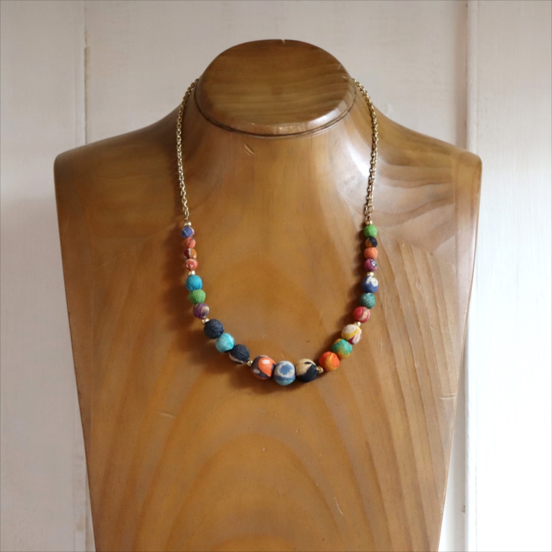 大きさの異なる布で包まれたビーズをつないだクラフト感あるネックレスです。