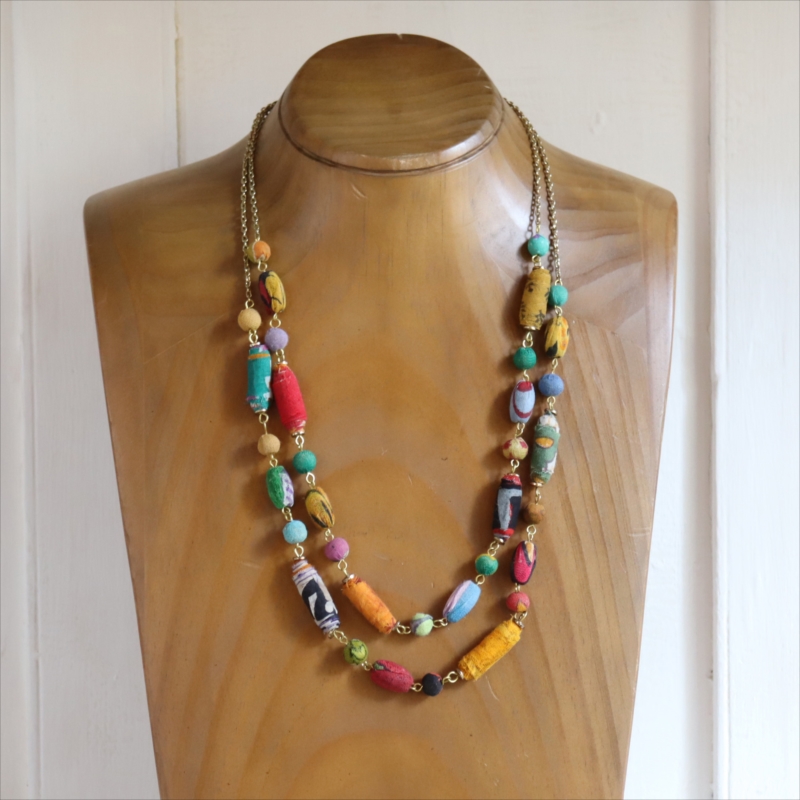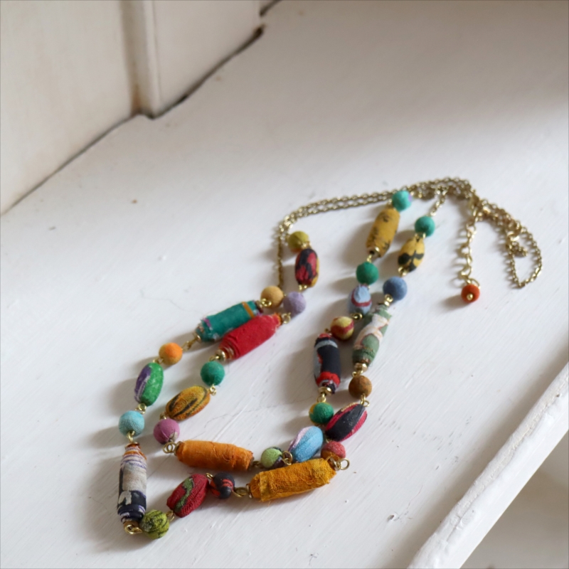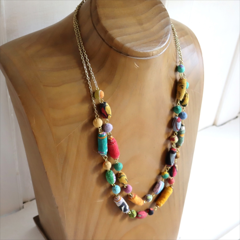リサイクルサリービーズ 2連ネックレス カラフルな手作り布ビーズ 1点もの