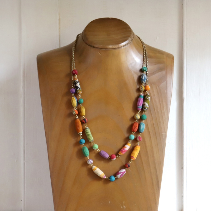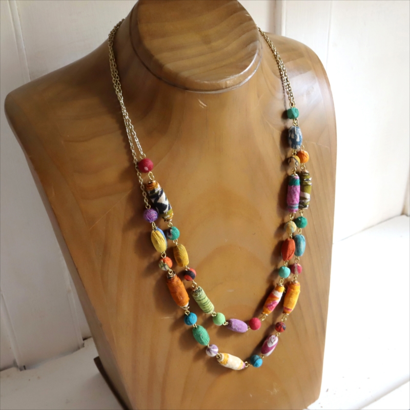 リサイクルサリービーズ 2連ネックレス カラフルな手作り布ビーズ 1点もの