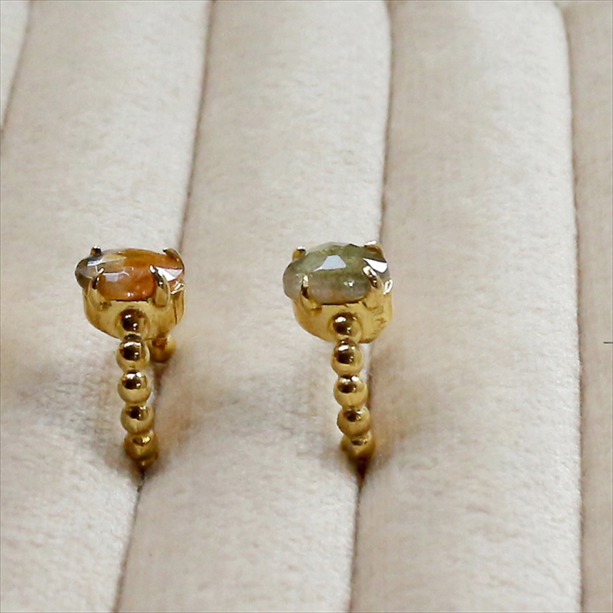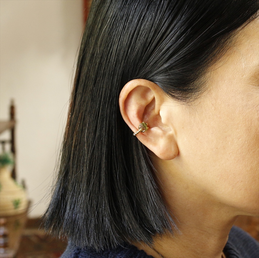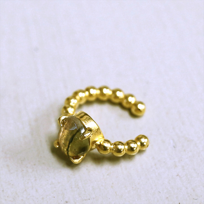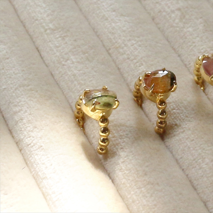 淡いピンクからグリーンの結晶のグラデーションが美しい、ウォーターメロントルマリンのイヤーカフ。ボールチェーン調のゴールドアームが柔らかな印象です。※石の大きさ0.7×0.4cm