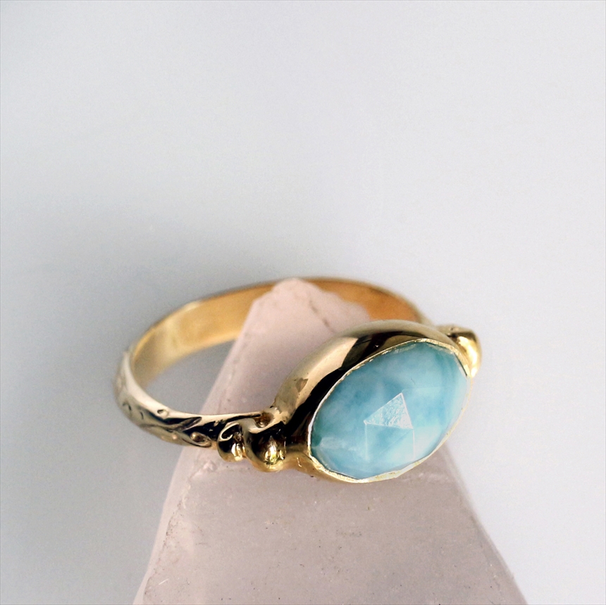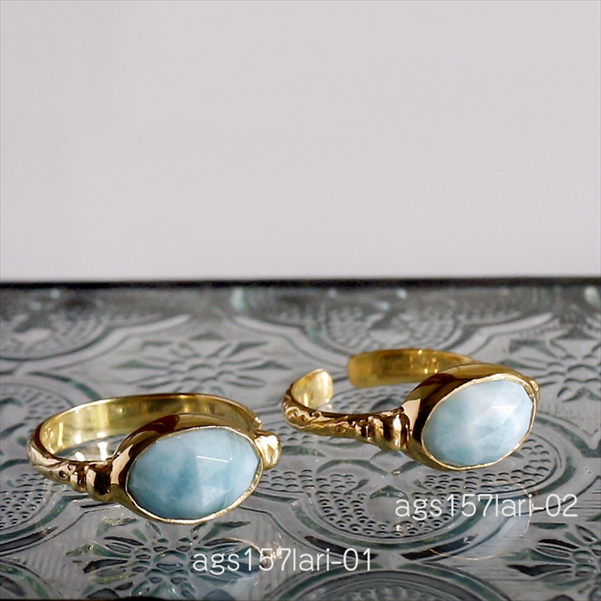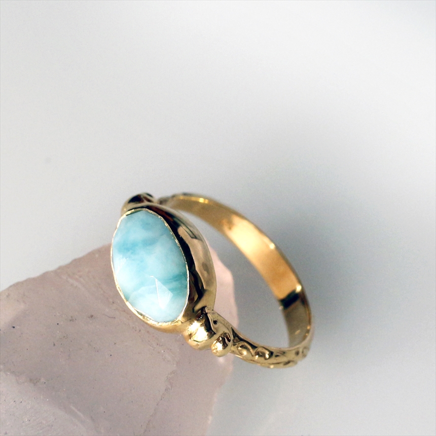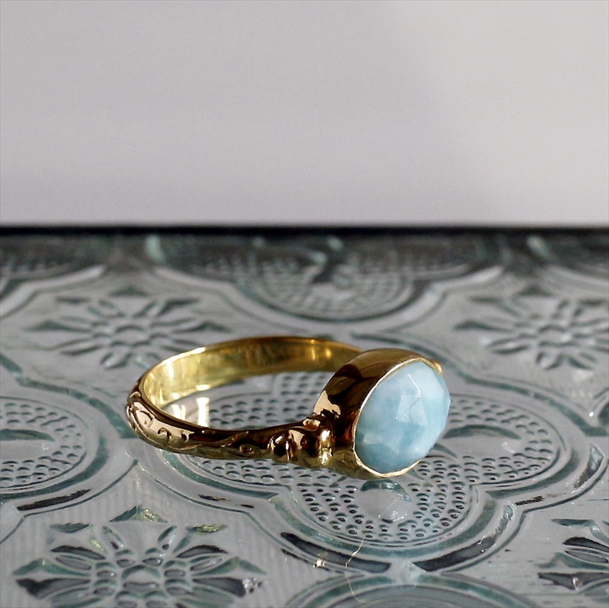 まるで空と海が混ざり合ったような、美しいブルーのグラデーションと、雲のように柔らかな模様のラリマー。繊細なローズカットが光を反射します。こちらは指に沿うような横向きに石がセッティングされていて、優し気な印象。