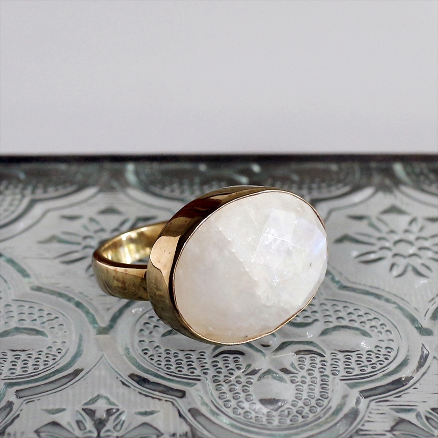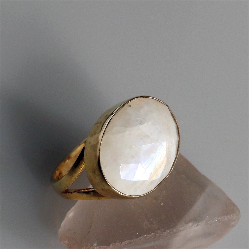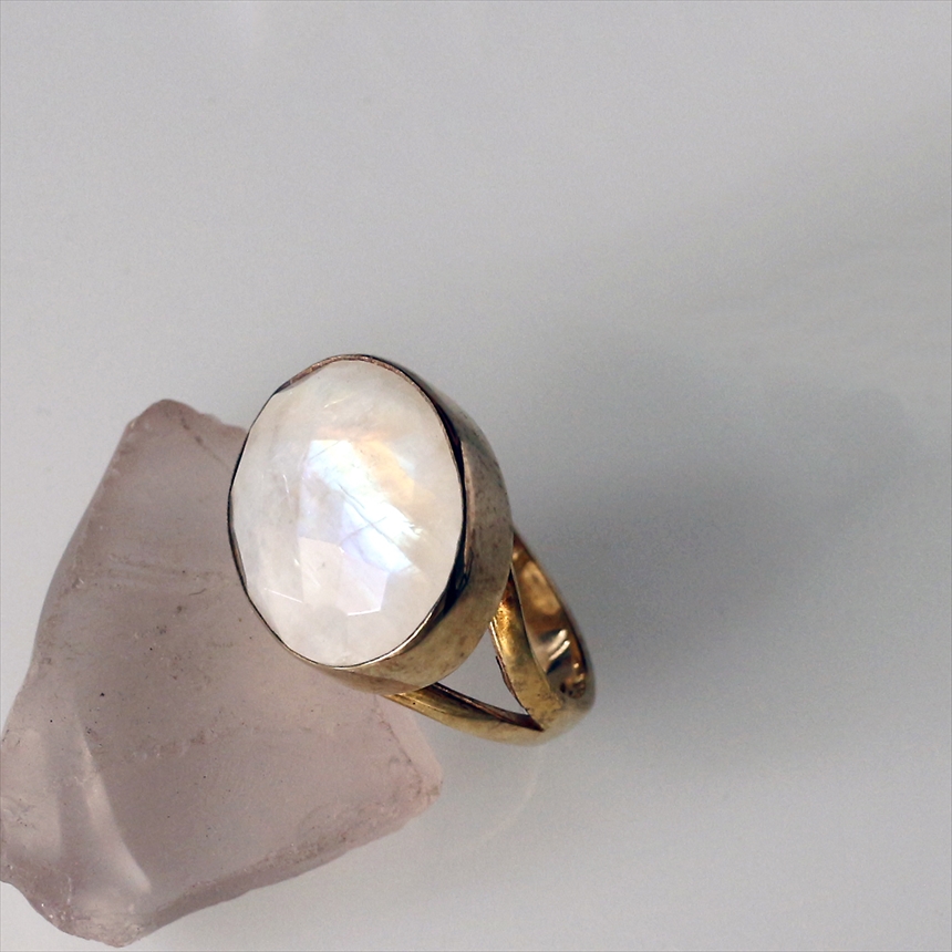 透明な光の中に、青や虹色のシラーがふわりと浮かぶ幻想的なレインボームーンストーンを、存在感のある太めのアームにしっかりと包み込んだ、力強くも美しいリングです。神秘的なきらめきを見せてくれます。