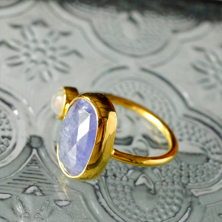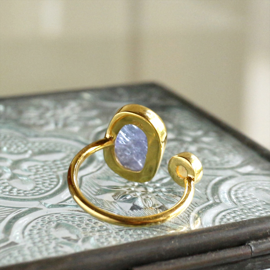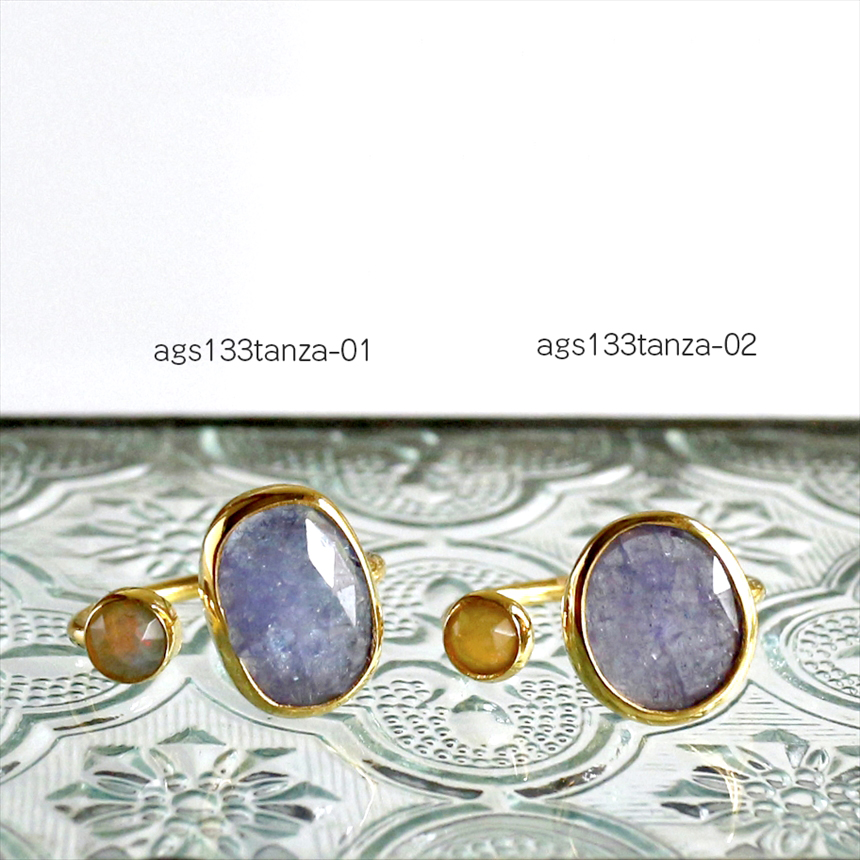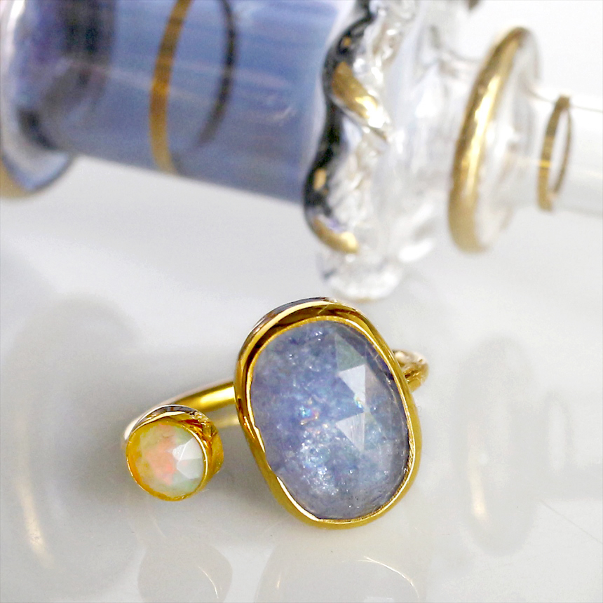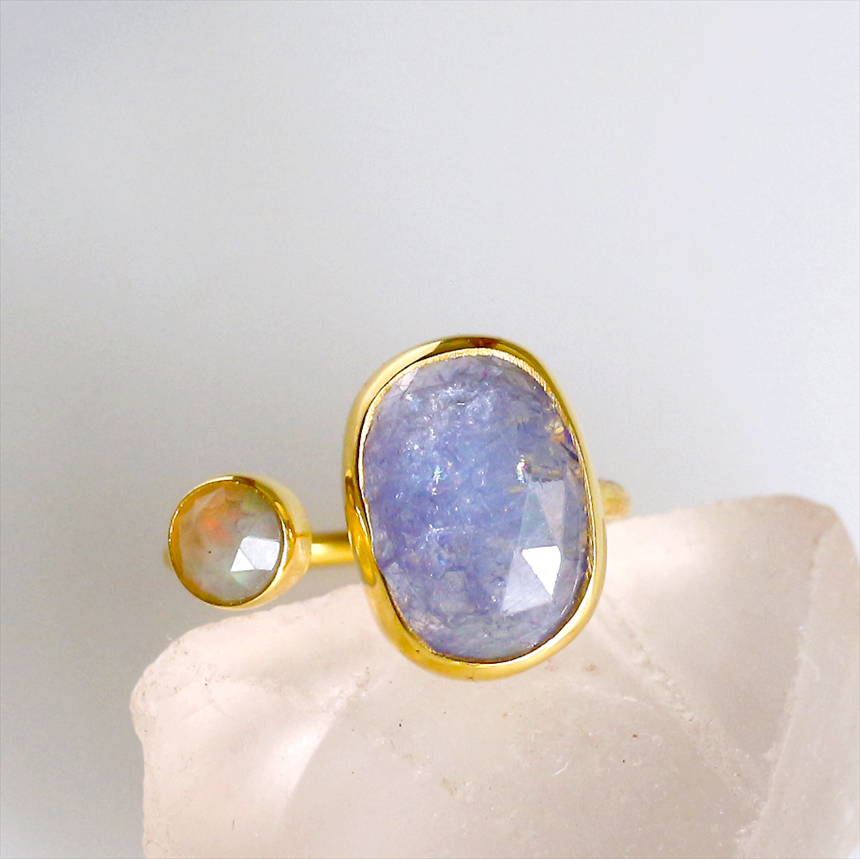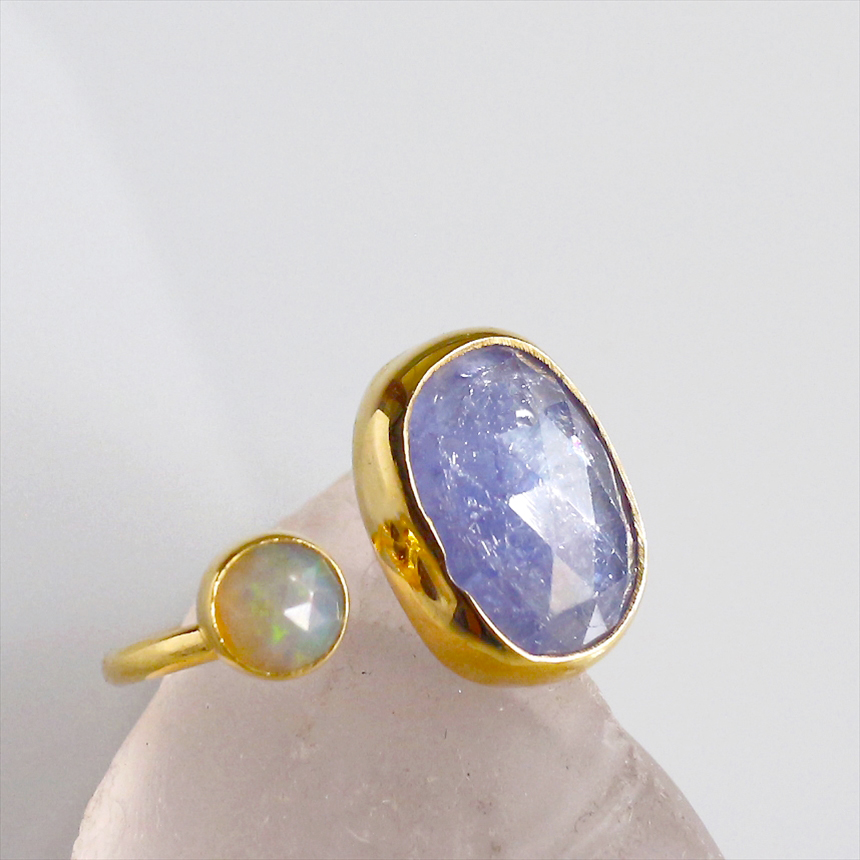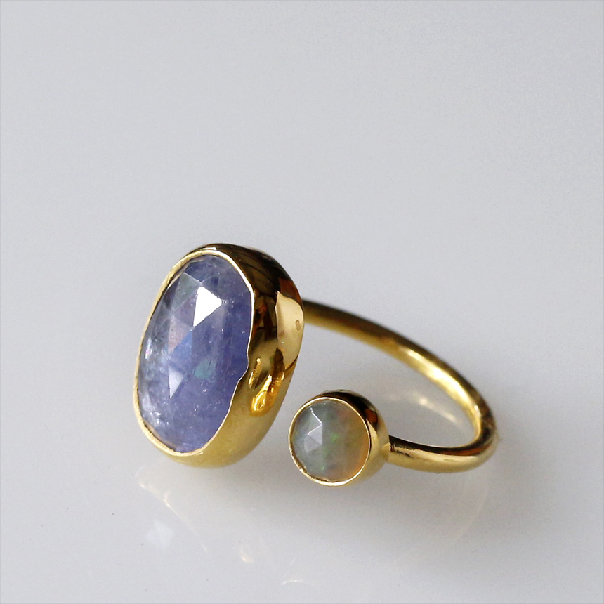 神秘的な青紫の輝きを放つタンザナイトと、柔らかなクリーム色にほんのりグリーンやオレンジカラーが揺れるように見え隠れする幻想的なオパール。異なる個性を持つこのふたつの宝石が並んだ美しいリングです。