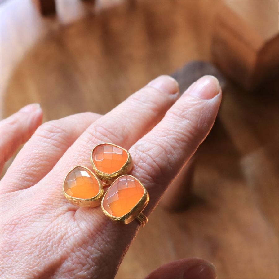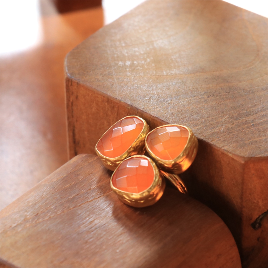 半透明のオレンジ色がきれいなカーネリアン3粒のリングです。カーネリアンは不純物もほとんどなく均一な色で、それだけに3つの石の形がひとつひとつ際立って見えます。それぞれの石にぴったりの枠を作る職人さんの丁寧な仕事が光る逸品です。