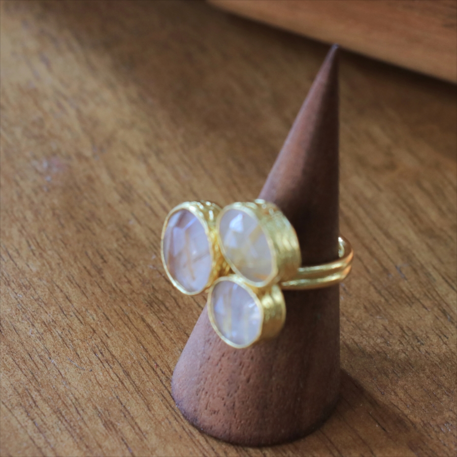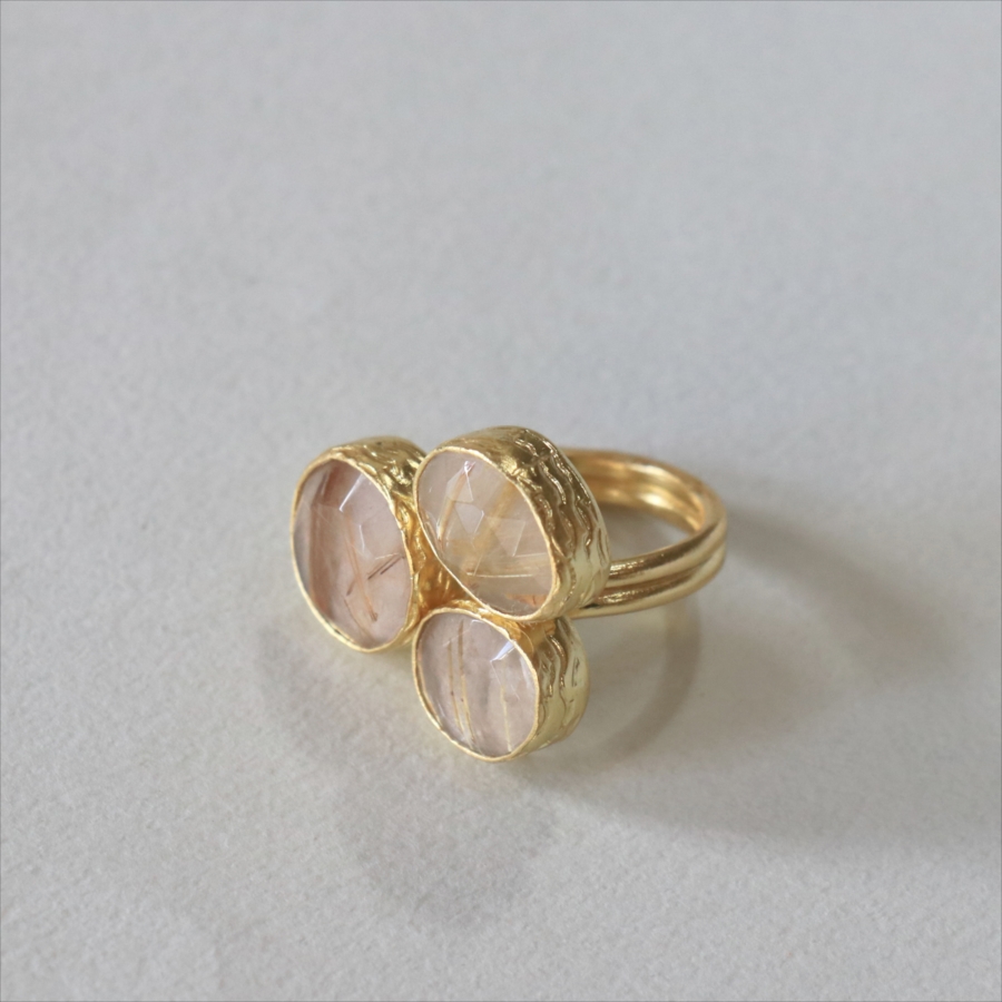 天然のクォーツに針のようなインクルージョンがはいったルチルクォーツのリングです。同じシリーズの3つの石リングの中では、やや小振りで、普段使いでも活躍しそう。肌なじみの良いカラーは違和感なく、合わせやすくおすすめです。
