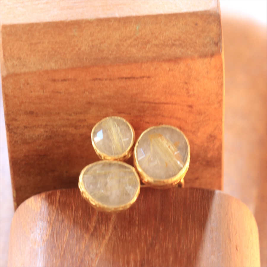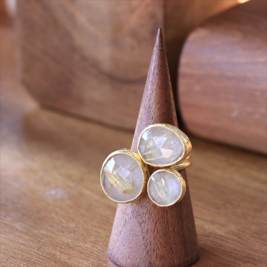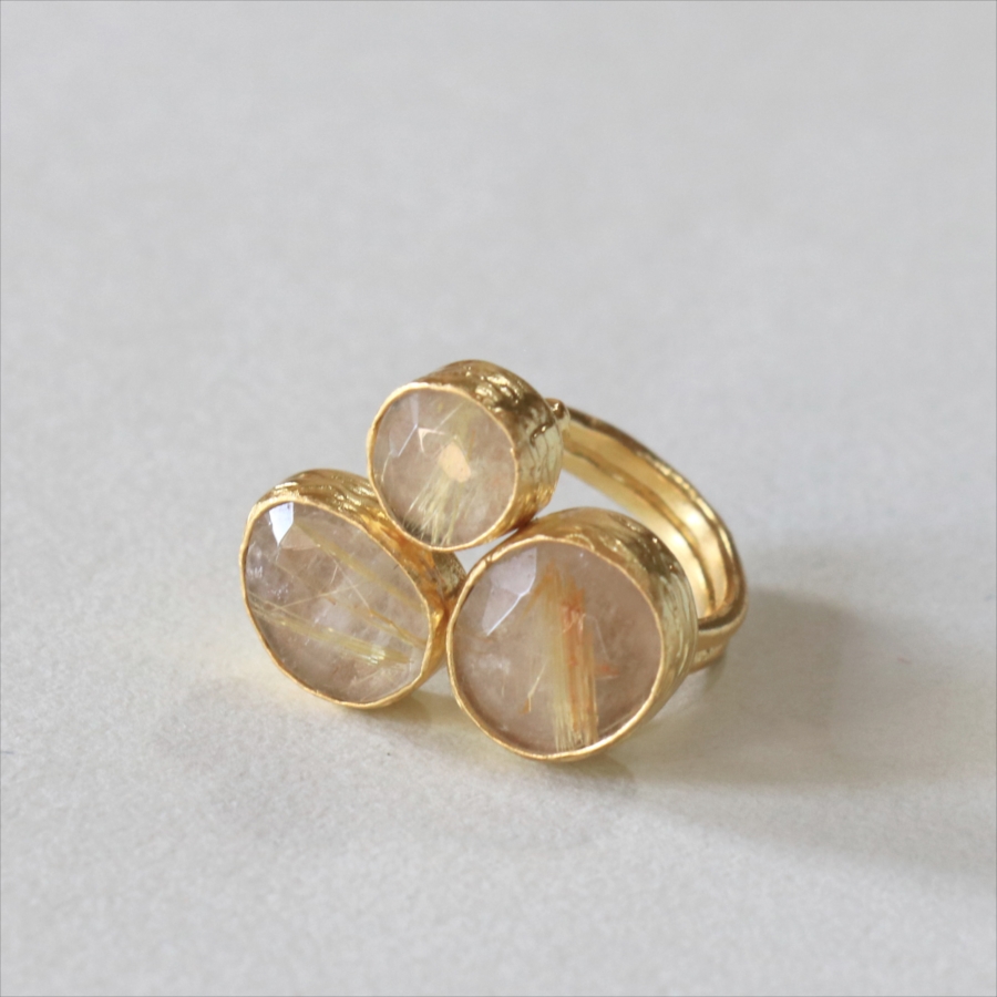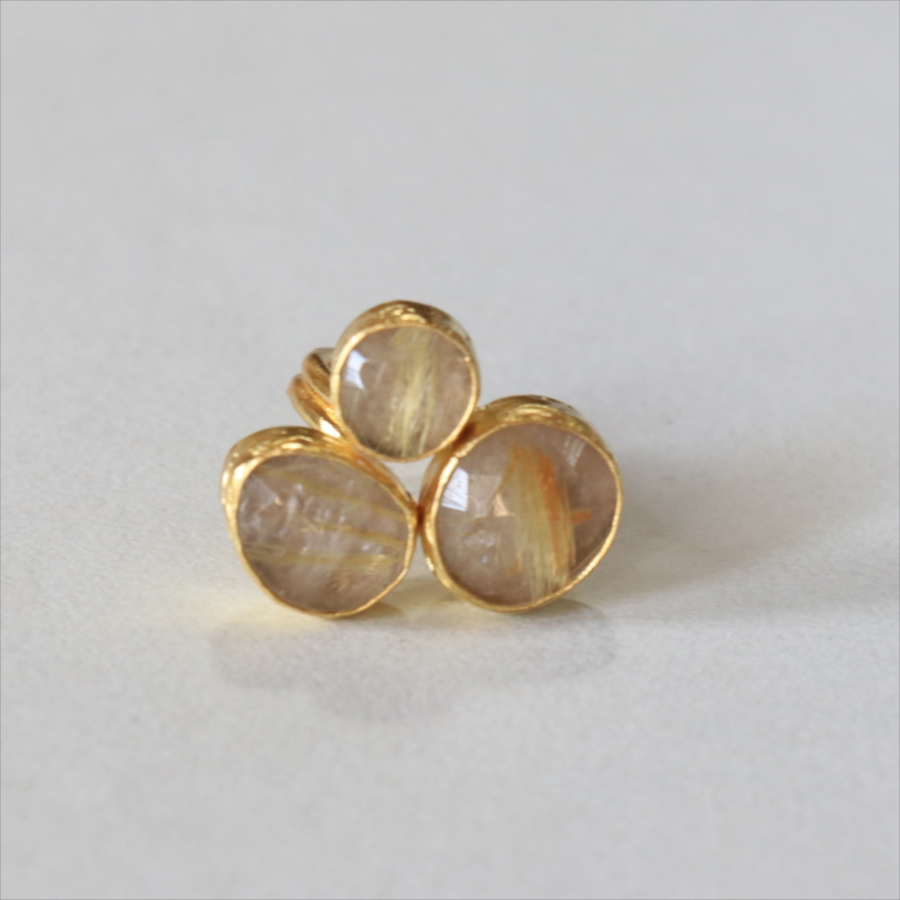 天然のクォーツに針のようなインクルージョンがはいったルチルクォーツのリングです。同じシリーズの3つの石リングの中では、やや小振りで、普段使いでも活躍しそう。肌なじみの良いカラーは違和感なく、合わせやすくおすすめです。