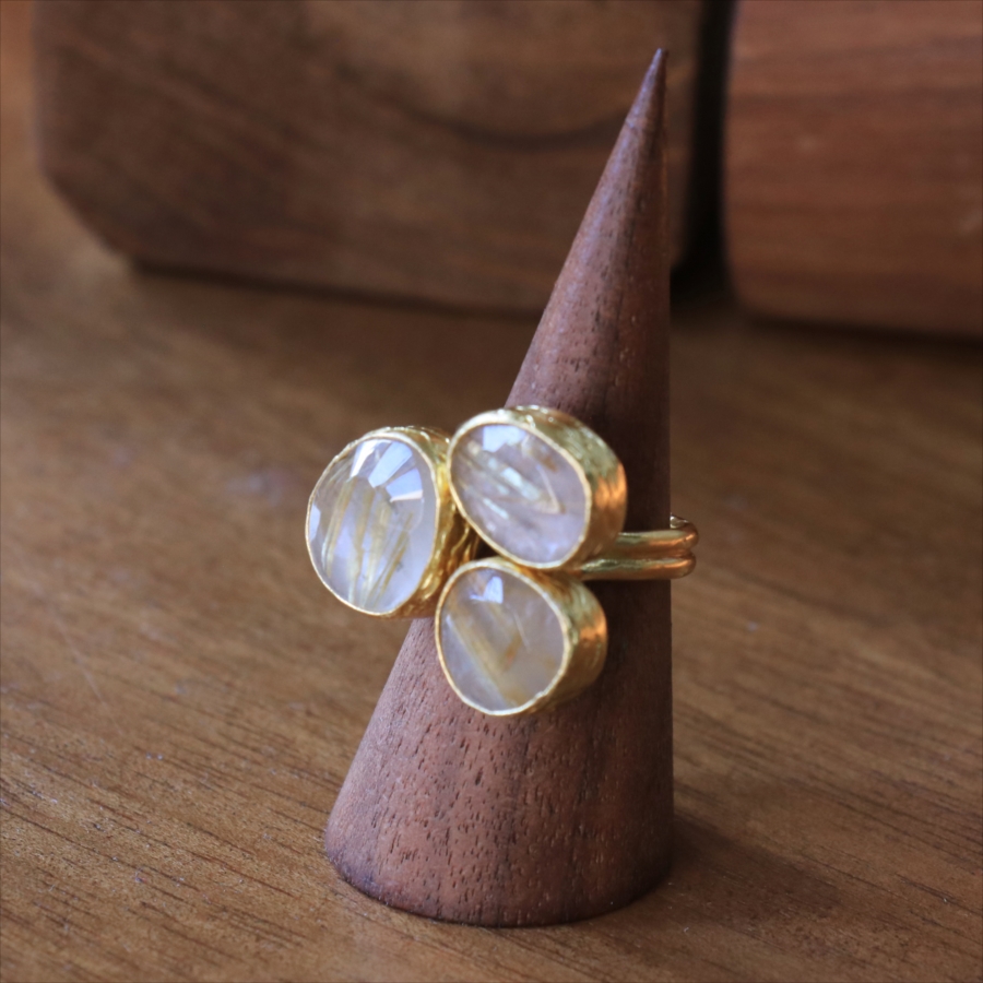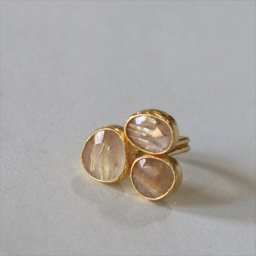 天然のクォーツに針のようなインクルージョンがはいったルチルクォーツのリングです。同じシリーズの3つの石リングの中では、やや小振りで、普段使いでも活躍しそう。肌なじみの良いカラーは違和感なく、合わせやすくおすすめです。