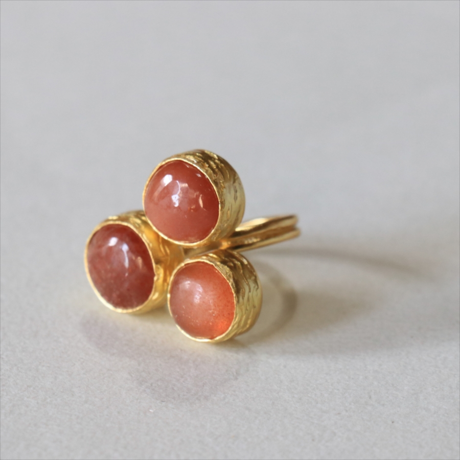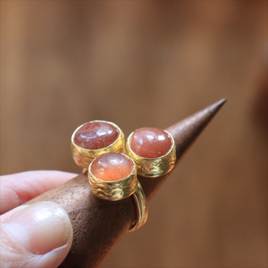 ほんのりブラウンがかったレンガの石の中に、よく見るときらきらと輝くインクルージョンがちりばめられたサンストーンが三つ並んだリング。コロンと丸形の3つの石はそれぞれ個性があり、ラメの様な輝きが光の射す角度によってきらめきます。