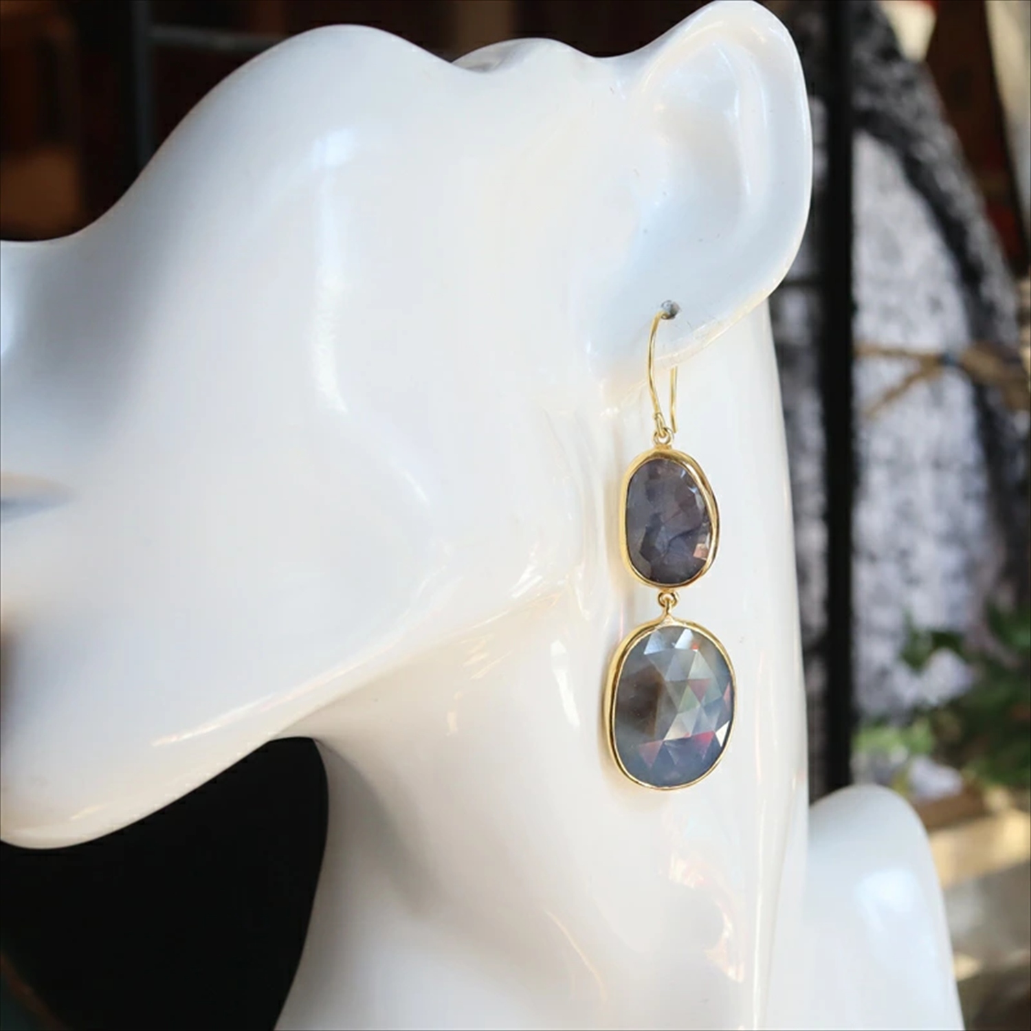 大粒の天然石を2粒つなげた贅沢なピアスです。素材の形をそのまま活かしたフレームで、すべてニュアンスの異なる一点もの。写真の現品をお届けします。