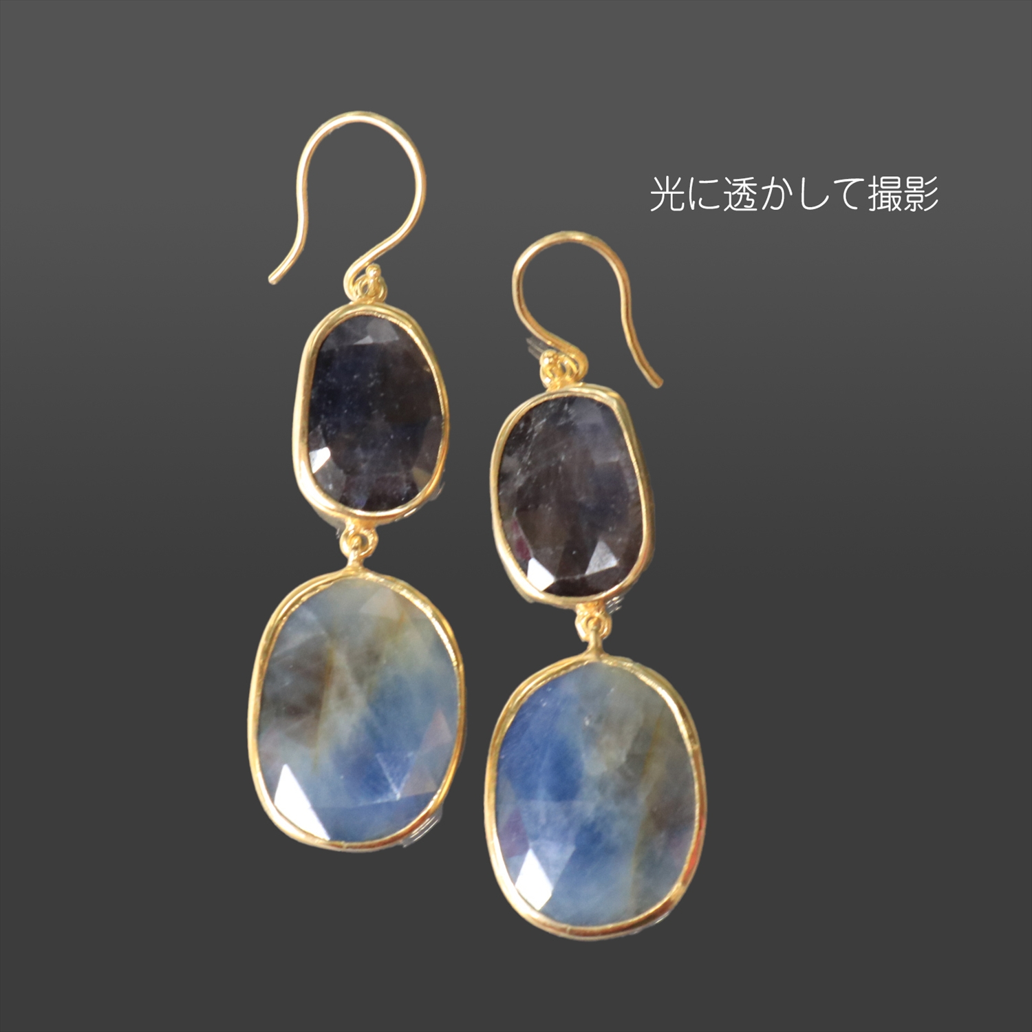 サファイアの表面はツヤがあり多面体カットでキラキラと反射します。光に透かすと、色ムラやインクルージョン(石の混入物)が見えますので、写真をご参照ください。