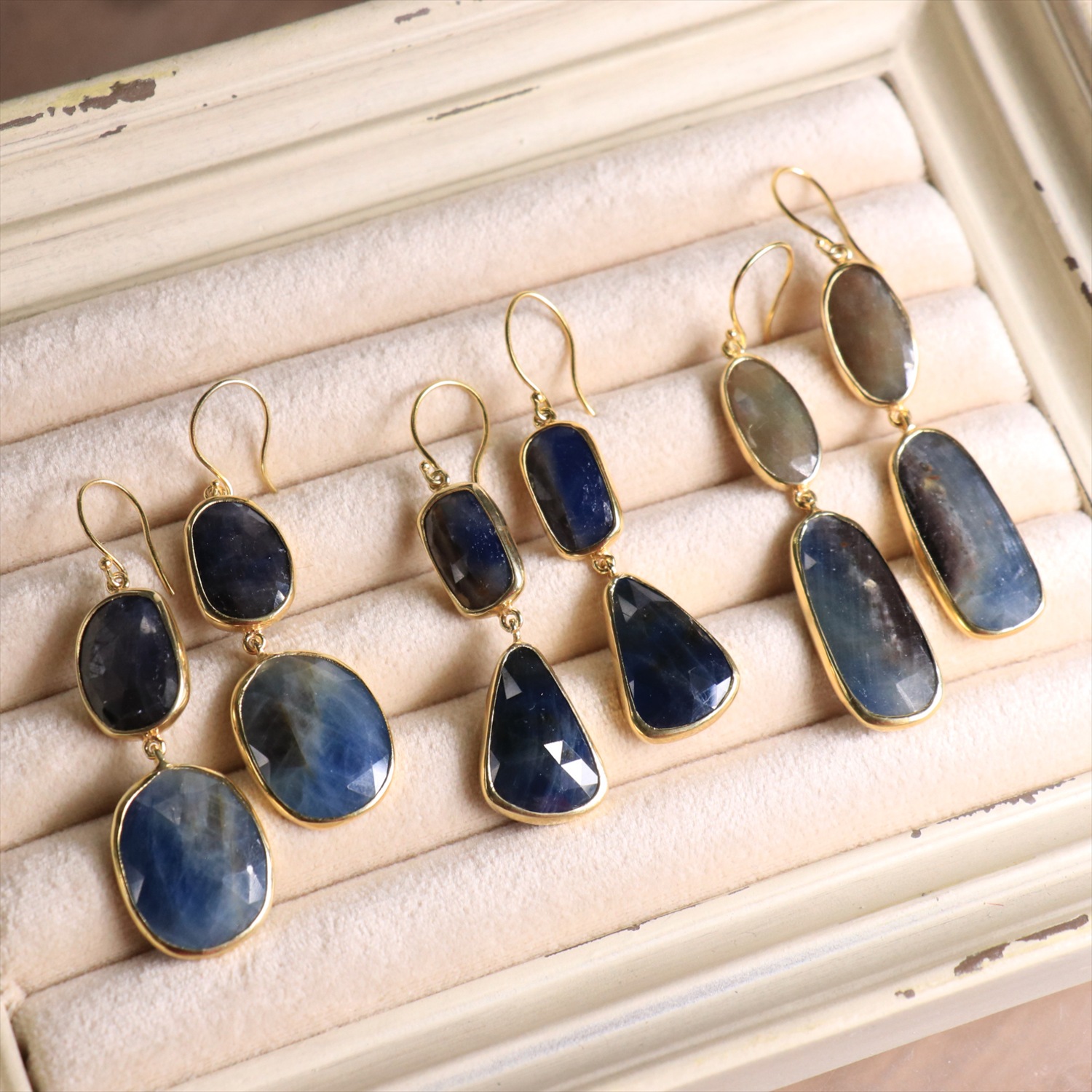 サファイアは光の当たり方によって様々に美しく変化して見えます。サファイアの産地はインド、デザインと制作はイスタンブル@トルコです。