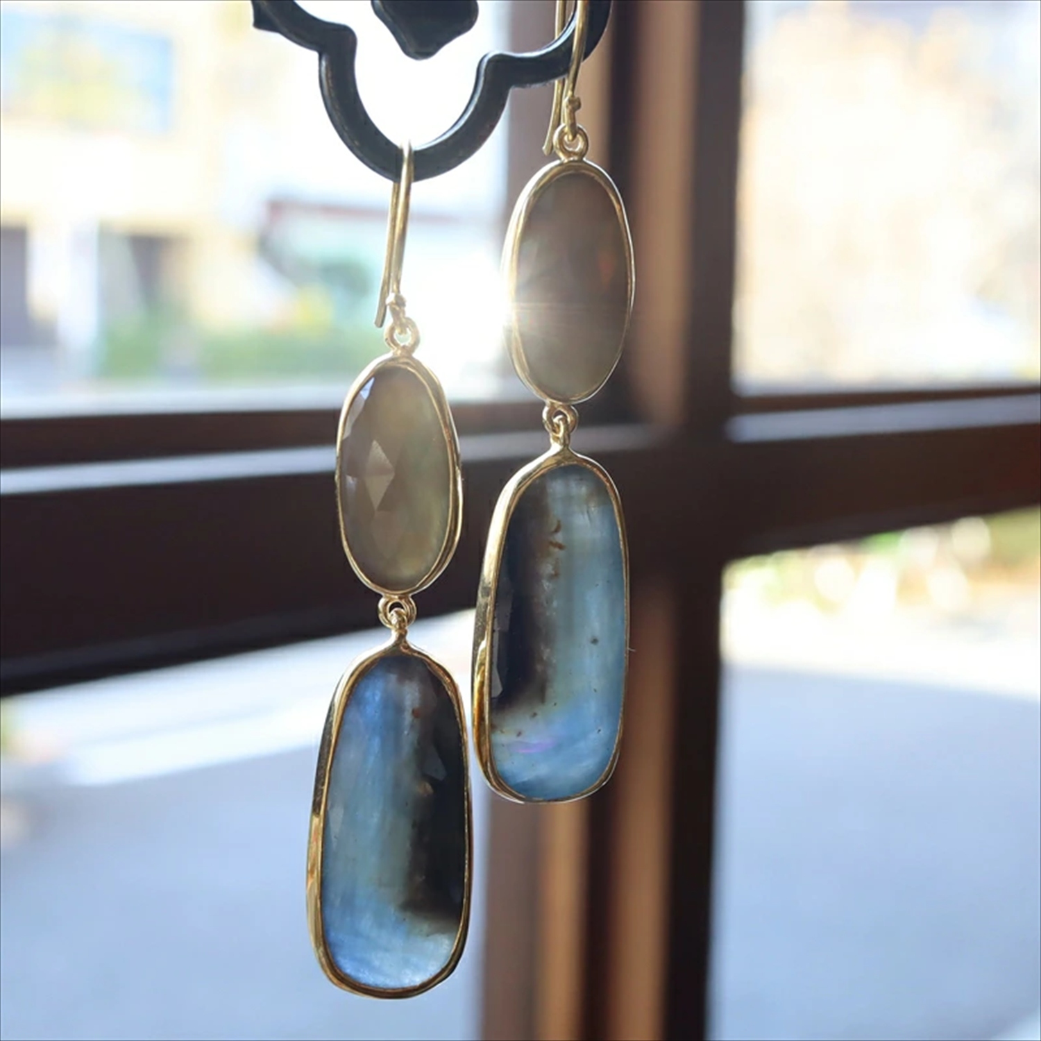 大粒の天然石を2粒つなげた贅沢なピアスです。素材の形をそのまま活かしたフレームで、すべてニュアンスの異なる一点もの。写真の現品をお届けします。